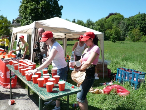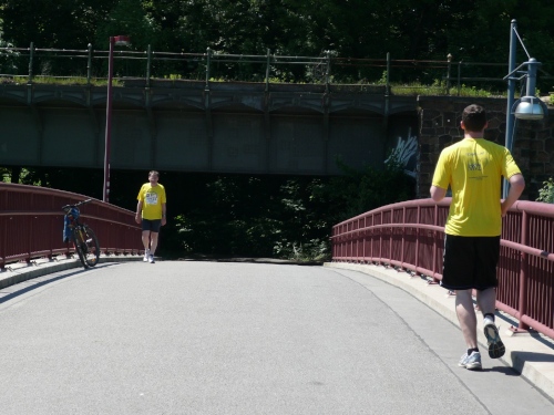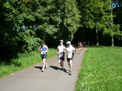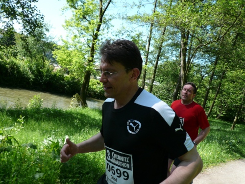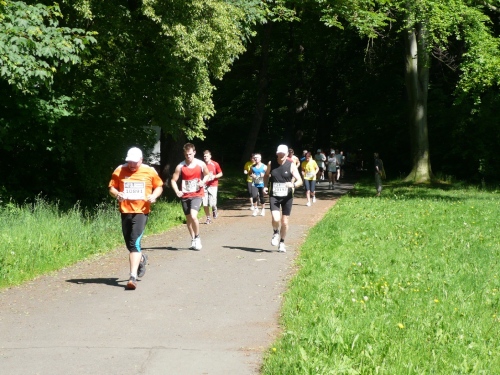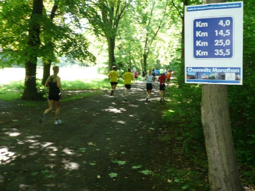 Verpflegungstechnisch ist alles im grünen Bereich. Wasser, Cola, Bananen und Iso wird angeboten. Habe ich was vergessen? Verdursten braucht da keiner und Wasser für die Birne gibt es auch genug. Zur Not kann man auch in die Chemnitz oder in den Stadtparkteich springen. Am Teich, den wir umrunden, ist die Wende. Zurück geht es auf teils gemeinsamen, teils auch getrennten Wegen im Park.