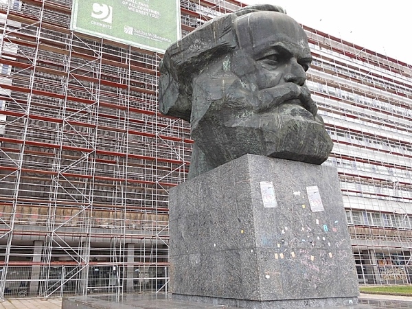 Ich weiß nicht, ob die Chemnitzer nach der Wende, als wir Ossis dem Hobby der Denkmalsstürmerei verfallen waren, mit dem Abriss des vierzig Tonnen schweren Philosophenkopfes überfordert waren. Oder ob es Weitsicht war - denn heute ist der Nischel ein Wahrzeichen der Stadt. An der Hauswand hinter der überdimensionalen Marx-Büste wurde aus aktuellem Anlass und in großen Lettern sogar eine bekannte Losung aus dem Kommunistischen Manifest angebracht: Fußballfans aller Länder, wir grüßen euch! Ja gut, die Losung wurde ein wenig abgeändert, aber der alte Marx hätte bestimmt nichts dagegen gehabt.