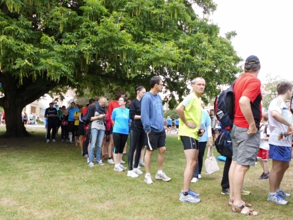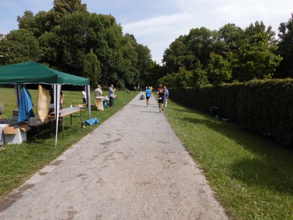 Die Ausgabe der Startunterlagen und die Gepäckabgabe sind gut organisiert. Wer nicht gerne läuft – der Start ist in unmittelbarer Nähe. Die Zeit bis zum Start kann man auf der Wiese oder auf einer Parkbank verbringen. Natürlich auch in einer Schlange vor der Ausgabe der Startunterlagen. Da muss man durch – oder das nächste mal etwas früher kommen.