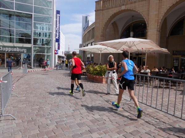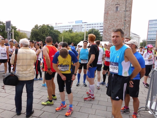 Einen knappen Kilometer laufen wir durch das Zentrum, über den Markt, passieren den ehemaligen Marathonstart. Als wir das Zentrum verlassen, steht da an einer Ecke ein kleiner Chor und singt: „Die Gedanken sind frei…“ Glücklich ist – wer heute nicht laufen muss!