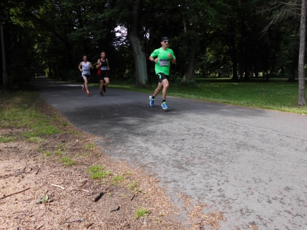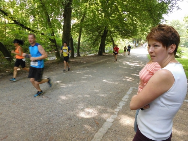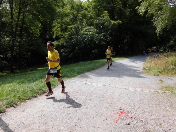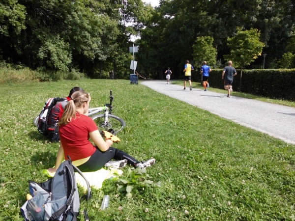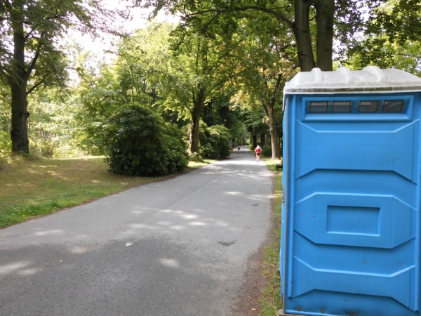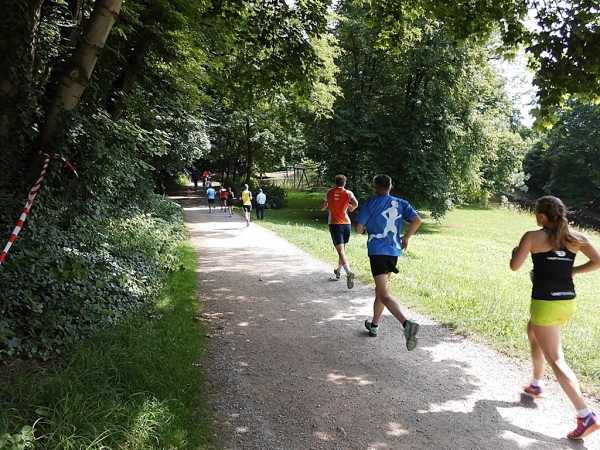 Dann begebe ich mich auf den nächsten Kilometer, der ist nicht ganz so aufregend, eine Hauptverkehrsstraße - so etwas gibt es nun mal in Großstädten. Aber ich habe Kilometer zwei noch nicht erreicht - da laufe ich schon im Stadtpark. Auf gut befestigten, teils asphaltierten Wegen. Bäume gibt es auch. Und da das Thermometer bestimmt schon die 25 Grad erreicht hat, sind mir Bäume sehr willkommen.