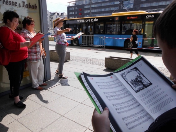 Etwa bei Kilometer sieben endet der Stadtpark, entlang einer Straße geht es durch ein ruhiges Stadtviertel, bevor ich noch einmal einige Meter Stadtpark passiere. Dort befindet sich die höchste Erhebung der gesamten Strecke - über den Daumen gepeilt zehn Höhenmeter. Das kostet Zeit – zum fotografieren - weil man dort wieder Musiker platziert hat. Chemnitz hat Kultur!