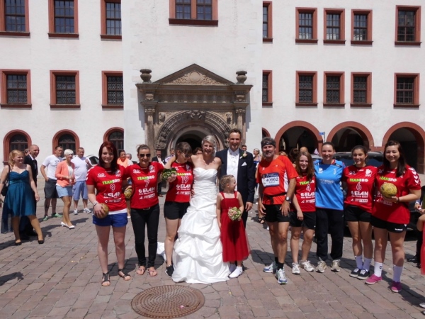 Dass meine Zeit am Ende nicht gerade Rekordverdächtig ist, liegt auch daran, dass ich in der dritten Runde an einer Hochzeit teilnehme. Stellt euch vor, ich komme vor das Rathaus, da stehen dort ein Brautpaar und viele Gäste. Da muss man doch gratulieren! Und aufs Hochzeitsfoto will ich auch! Das Bild ist beim Laufbericht dabei. Ich bin der, zu dem alle etwas Abstand halten. Wenn ich wieder mal an einer Hochzeit teilnehme, dusche ich vorher.