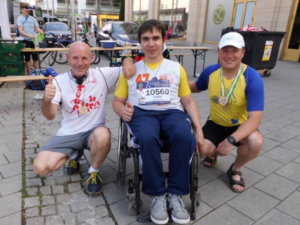 Dieter Fromme ist übrigens schon mehrfach in Chemnitz gelaufen und hat dabei vor einigen Jahren Lukas Klitzsch kennengelernt. Einen Jungen im Rollstuhl – der inzwischen 18 Jahre alt ist. Zwischen beiden hat sich eine Freundschaft entwickelt. Man trifft sich, wenn es sich einrichten lässt. Lukas hat heute den Viertelmarathon absolviert. Und wenn ich seine Zeit auf meine hochrechne, war er schneller als ich. Und das im „normalen“ Rollstuhl!