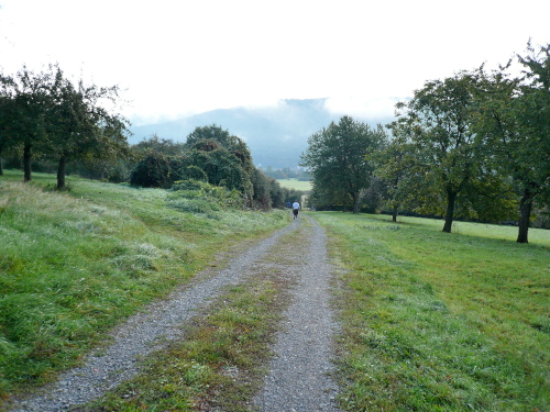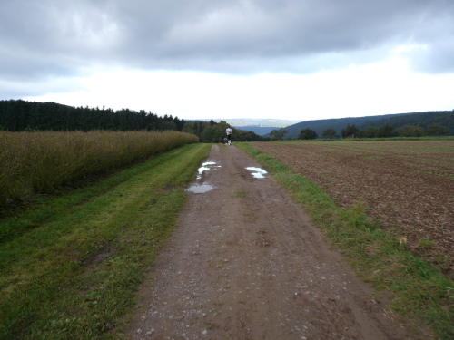 Wieder recht trailig, teils an Feldrändern entlang und über Wiesenwege hinweg ging es nun leicht wellig aber tendenziell bergab in Richtung Elsenfeld. Noch bevor wir den Ortsrand von Elsenfeld erreichten, wurden wir mit einem erneuten Anstieg von rund 75 Höhenmetern auf 1,5 Kilometer Länge belohnt. Nach einer kurzen flachen Passage konnte man der Schwerkraft seinen Lauf lassen und ins Tal hinunter rollen. Die letzten 1,5 Kilometer dieser vierten Etappe waren überwiegend flach und so war auch die Ankunft in Elsenfeld relativ entspannt. Neben der üblichen Verpflegung, gönnte ich mir ein alkoholfreies Hefeweizen und ging mit frischem Elan die letzten 15,6 Kilometer dieser Reise an.