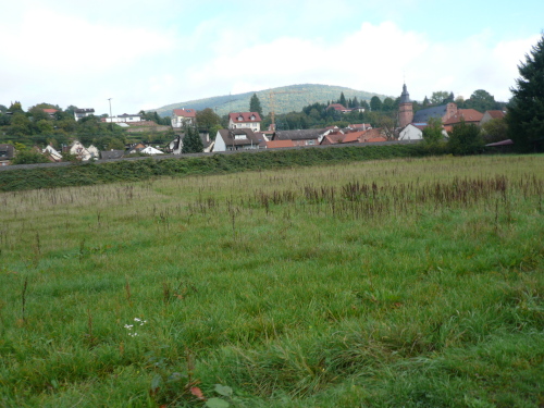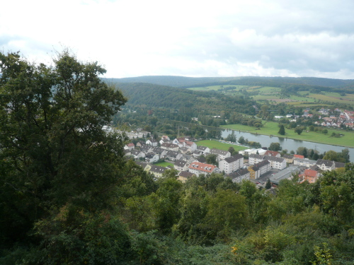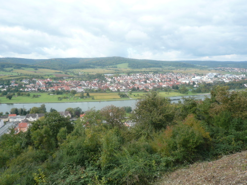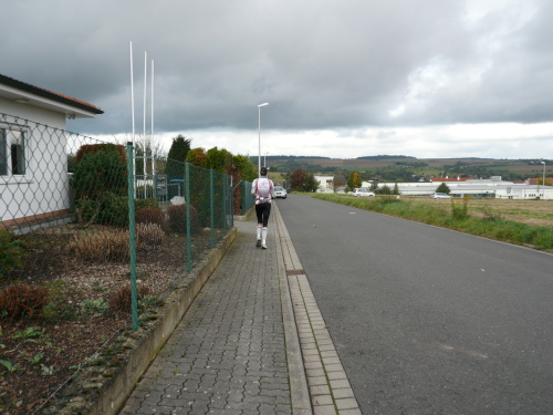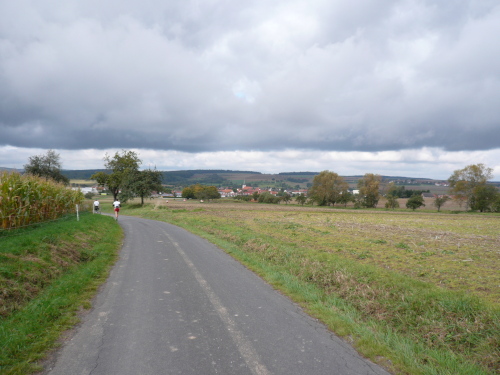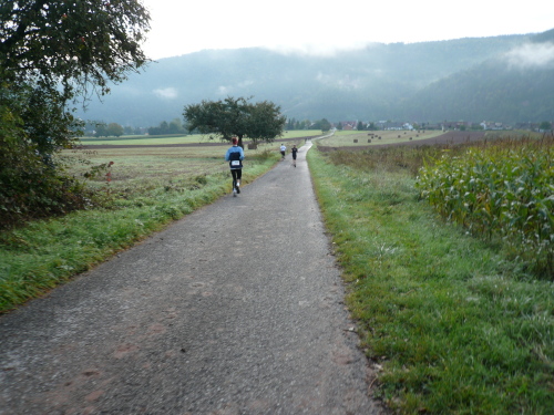 Wir verließen leicht bergan laufend Elsenfeld und streiften kurze Zeit später das Kleinwallstädter Industriegebiet. Nach einer weiteren Verpflegungsstelle erwartete uns der Anstieg „Am Viehtrieb“ mit 150 Höhenmetern auf vier Kilometern. Auf der Höhe, durch den Wald und über einen Wiesenhang bergan laufend, hatte man einen schönen Ausblick auf Hausen und Hofstetten. Nachdem wir den Höhepunkt dieser Etappe passiert hatten, ging es bergab mit einigen kleineren Gegenanstiegen hinunter ins Maintal nach Dornau, wo nach einem kurzen Flachstück die letzte Verpflegungsstation auf uns wartete.