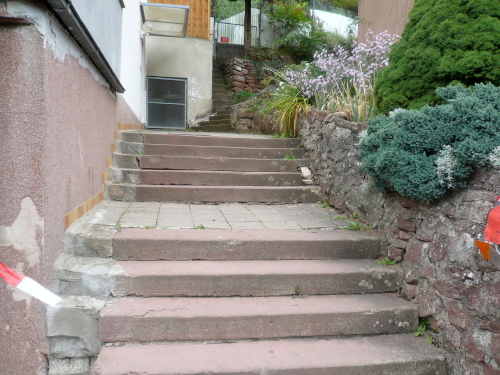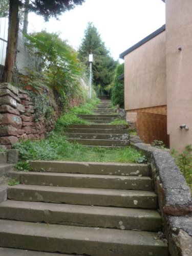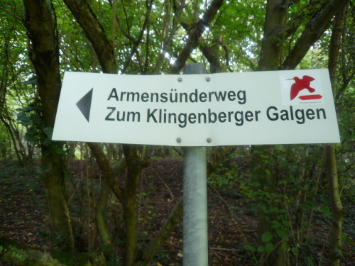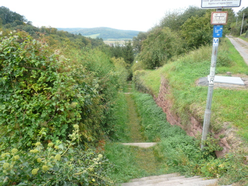 Es waren nun rund 45 Kilometer und 1200 Höhenmeter überwunden. Zeit für ein Pläuschchen und Päuschen. Zur Erholung durften wir den folgenden Kilometer auf gut zu laufender Straße bergab nach Klingenberg hinein laufen. Doch die Freude währte nur kurz, denn anschließend ging es wieder bergauf. Sogar die Mechenharder Treppe stellte sich dem problemlosen Vorwärtskommen in den Weg. Nach Bewältigung dieser Treppenstufen kamen wir über einen Singletrail auf den Armesünderweg. Ein bezeichnender Name, denn was müssen das für Sünder sein, die sich diese Strapazen von 73,8 Kilometer und 1800 Höhenmetern freiwillig antun? Die Bezeichnung galt wohl eher den armen Sündern, die zwischen dem dreizehnten und neunzehnten Jahrhundert am benachbarten Galgen ihr Leben verloren.