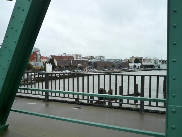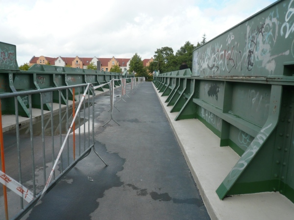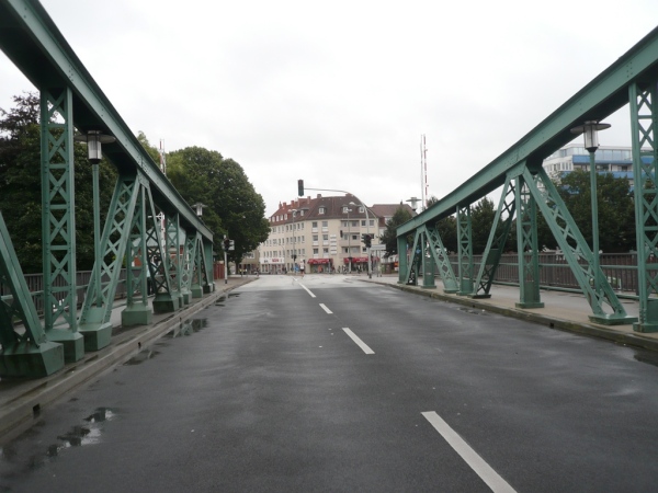 Hinter dem Platz geht es jetzt leicht aufwärts zur Geeste. Sie ist der letzte Nebenfluss, der in die Weser mündet. Von ihren ehemals fünf Schleifen durch das Stadtgebiet sind noch drei erhalten. Wir laufen über die Neue Alte Geestebrücke von 1904. Nachdem die alte Prahmfähre für den immer höher werdenden Verkehr nicht mehr ausreichte, wurde eine zweiflügelige Drehbrücke mit 56 Fuß (1 Fuß in Bremen ist 289,35 mm lang) lichter Weite gebaut. 1856 wurde mit dem Bau der Geestebrücke begonnen und am 8. Januar 1857 wurde sie eingeweiht. Anfangs verliefen auch Gleise für die Pferdebahn über die Brücke.