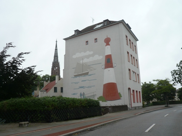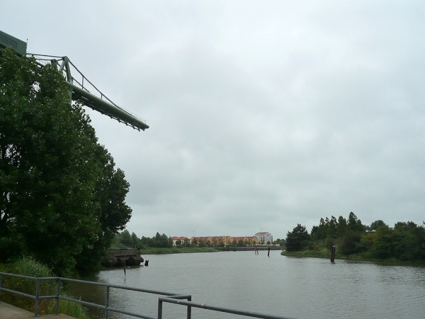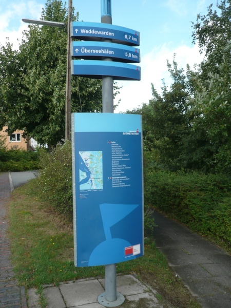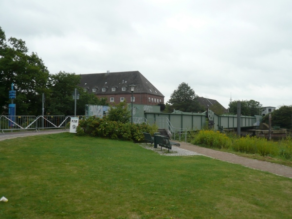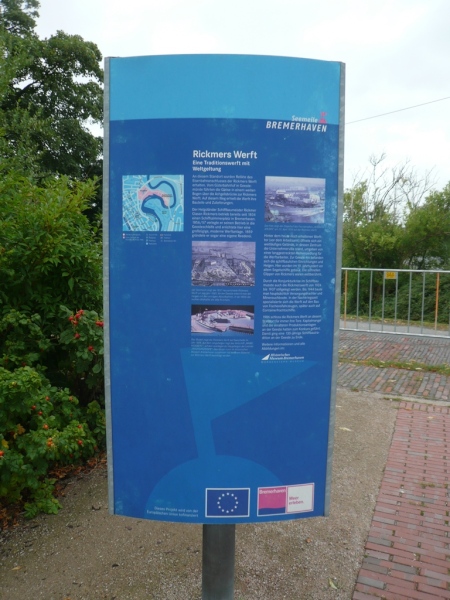 Wir kommen wieder in den Park, den wir dann am nördlichsten Punkt verlassen. Später umlaufen wir die Geestschleife und folgen ein kurzes Stück dem Geestewanderweg. In der Nähe der Agentur für Arbeit stand früher am Wasser die ehemalige Rickmerswerft, wo über 150 Jahre lang Schiffe gebaut wurden. Heute erinnern nur noch das Werfttor und der Drehkran an das traditionsreiche Schiffbauunternehmen, das 1986 die Tore schließen musste. Jeder der an die Landungsbrücken in Hamburg fährt, sieht dort das Museumsschiff „Rickmer Rickmers“, ein dreimastiges, stählernes Frachtsegelschiff (Stapellauf August 1896), das hier erbaut wurde. Gegenüber in der Schleife ist die Marineschule.