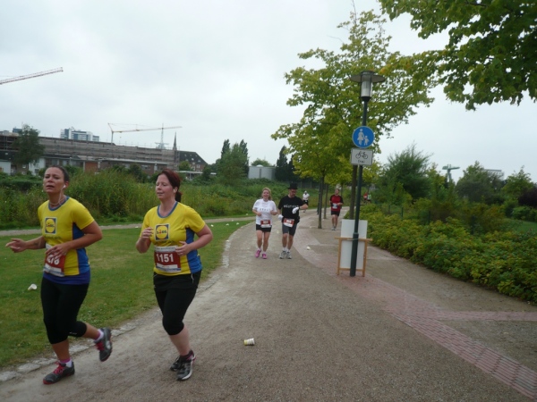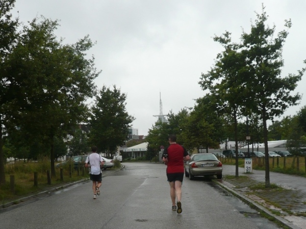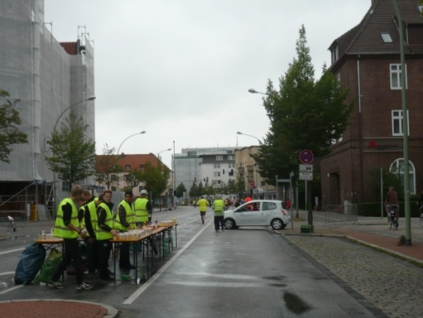 Im Kapitänsviertel bieten nette Menschen Getränke an. Ihre gute Laune überträgt sich auf die Läufer. Im Regen geht es zurück zur Großen Kirche.