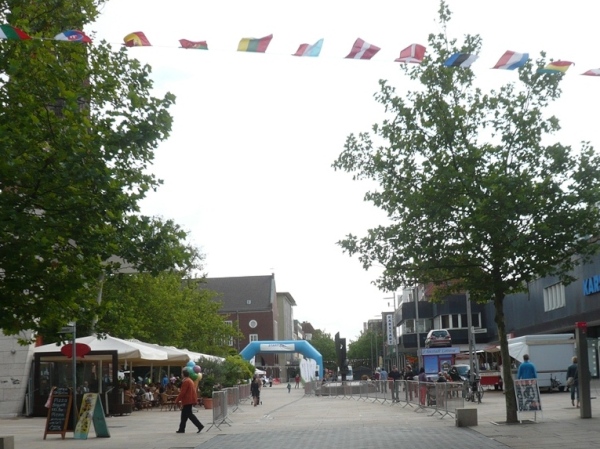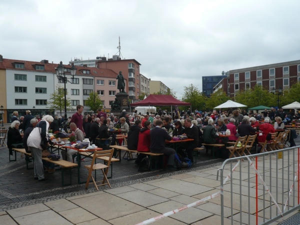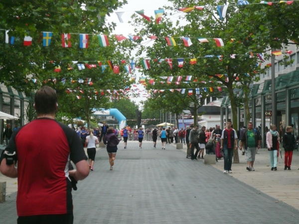 Von den rund 900 Startern sind bereits über 500 im Ziel. Auf dem Theodor-Heuss-Platz ist jetzt richtig viel Betrieb. Viele Menschen nutzen den Sonntag, um zu brunchen und klatschen uns Läufern auch kräftig zu.