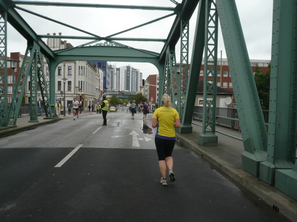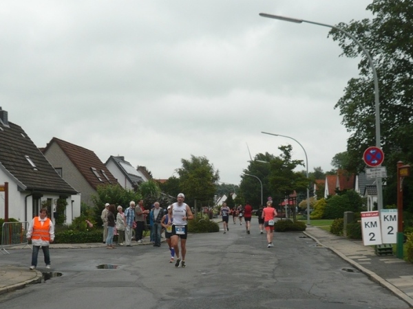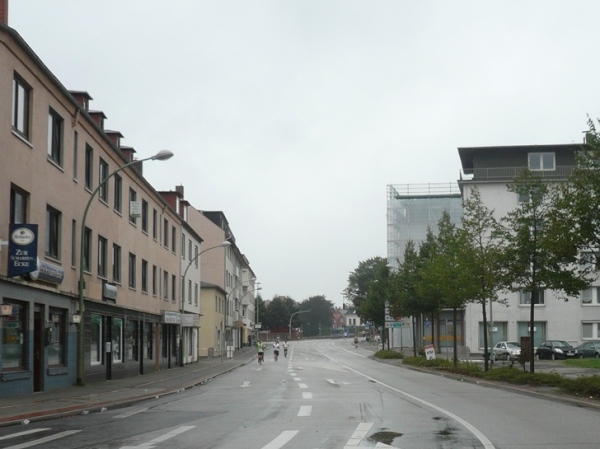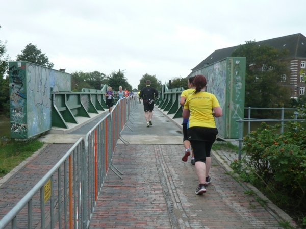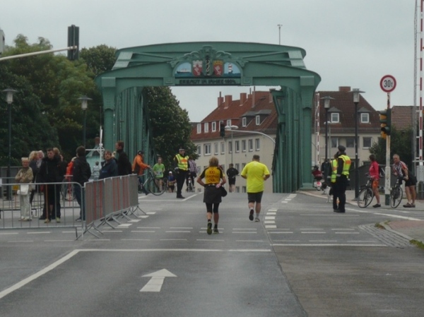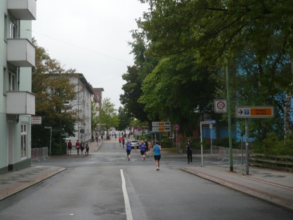 Ein Stück weiter haben Anwohner einen Wasserstand aufgebaut und sind mit viel Herzblut bei uns Läufern. Super, Klasse danke. Am Ende vom Geestheller Damm überqueren wir die Geeste bei km 9. Hinter der Brücke befindet sich die Wende für die Marathonis. Es geht zurück über die Brücke zum Kapitänsviertel, in dem einige Straßen nach berühmten Kapitänen benannt sind (Dietrich Ballehr, Hans Peter Ferdinand Gluud, Ralf Zander, Nikolaus Johnsen und Adolf Ahrens).