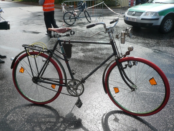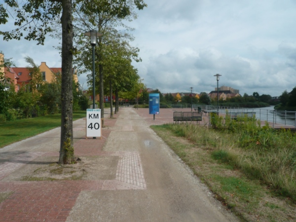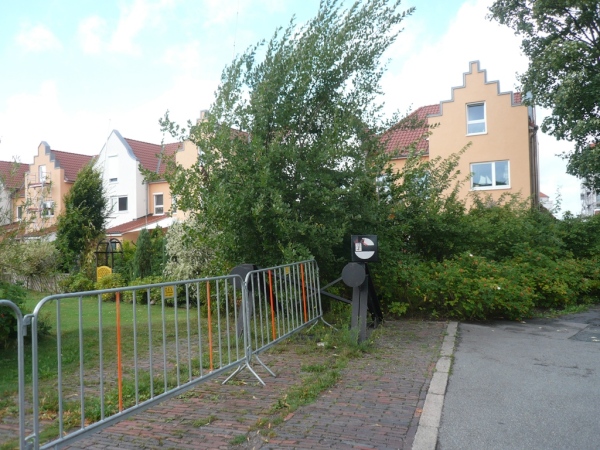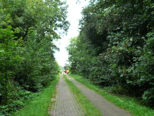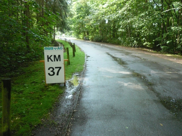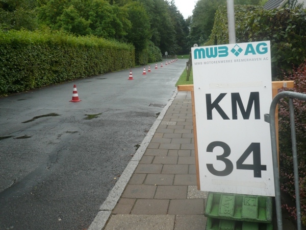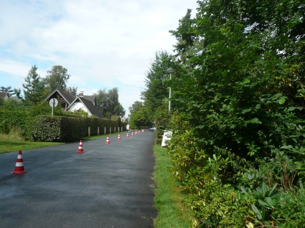 Kurz vor der Weiche wird es eng, denn wir haben nur noch einen schmalen Streifen am Wegrand für uns. Hier gibt es etwas Autoverkehr, denn ein Stück weiter befinden sich die Sportplätze, wo heute ein Fußballturnier stattfindet. Da das Feld schon weit auseinander gezogen ist, gibt es aber keine Probleme.
