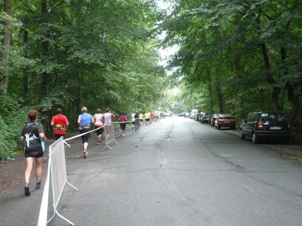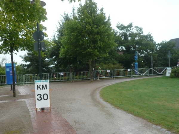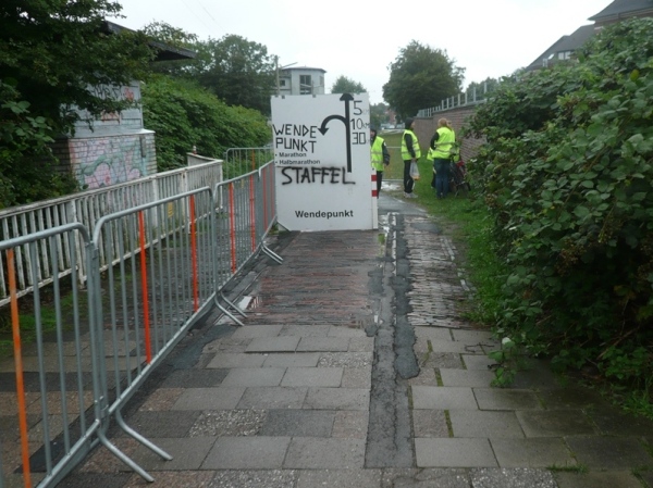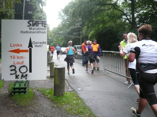 Dann kommt die Weiche, an der die Marathonis und Halben sowie die Staffelläufer noch etwas geradeaus laufen und die 10er und 30er schon nach links abbiegen. So kommt man auf die exakten Streckenlängen.