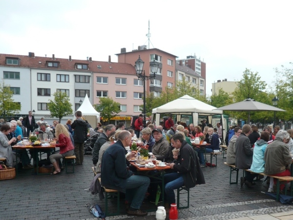 Auf dem Theodor-Heuss-Platz beginnt der Bürgerbrunch der Bremerhavener Bürgerstiftung. Gegen eine Spende konnte man sich einen Tisch direkt an der Laufstrecke reservieren.