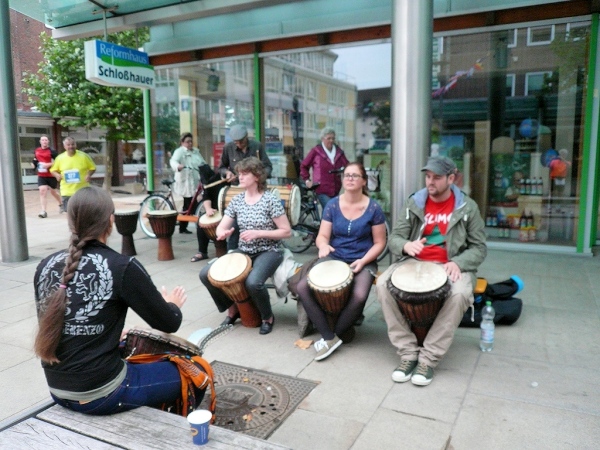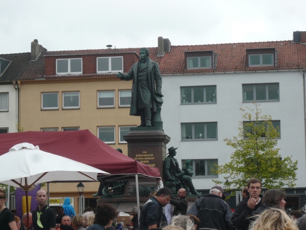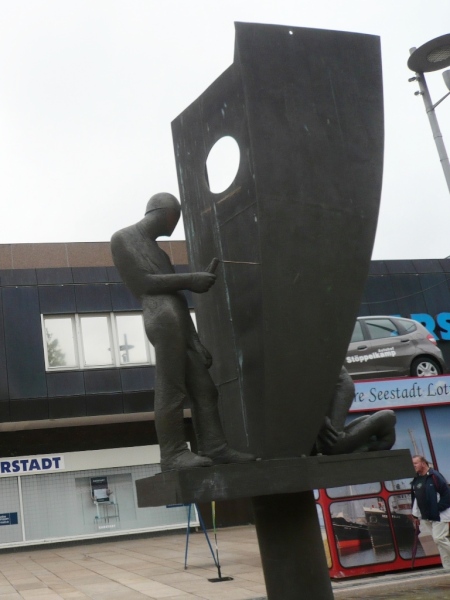 Wir folgen der Geeste in Fließrichtung (Ebbe). Irgendwo verlassen wir die Grünanlagen und kommen in die Fußgängerzone. Schon von weitem sehen und hören wir den Zielsprecher. Wir laufen noch am Werftbrunnen von Waldemar Otto vorbei. Der im Künstlerdorf Worpswede lebende Künstler hat diesen schönen Brunnen entworfen.