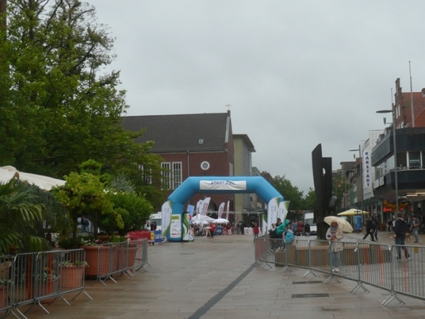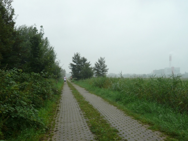 Die Bruncher haben sich ins Trockene zurückgezogen und im Bürgerpark sind wir jetzt ganz alleine und kämpfen gegen Wind und Wetter. Das Müllheiz-Kraftwerk ist im Regen und Dunst kaum zu erkennen. Wieder die Fußgängerzone und durchs Zieltor. Auch die 3. Runde ist beendet. Artur will mich gerade als Finisher interviewen. Sorry, zuerst noch eine Runde.