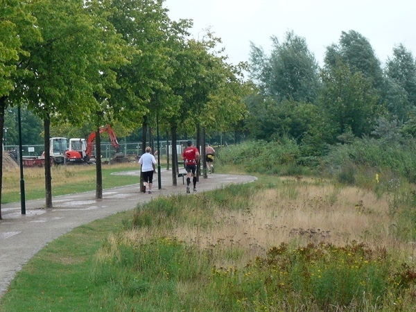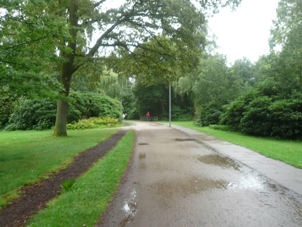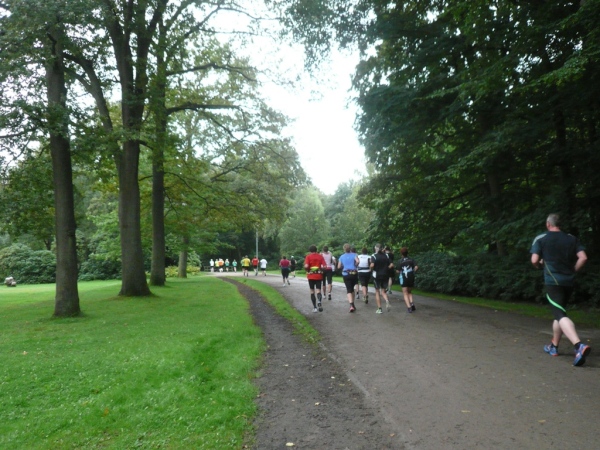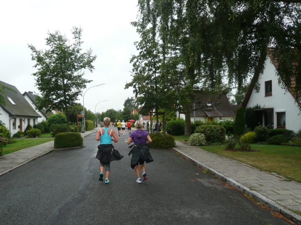 Viele Menschen hat es in den Vorgärten ihrer schönen Einfamilienhäuser gezogen, um die Läufer zu beklatschen. Es geht in den Bürgerpark. Die drei Bremerhavener Bürger Johann Ganten, H. Brüntjes und Johann Wichels wollten in Stadtnähe einen kleinen Wald zur Erholung anlegen. Aus der Idee vom Dezember 1899 ist heute ein großer Waldpark entstanden. Wir umlaufen ihn gegen den Uhrzeigersinn und kommen so am Bauerngarten und Rosengarten vorbei. Auf der linken Seite befindet sich auch ein kleiner Tierpark. Auf der ersten Runde sind jedoch noch keine Tiere zu sehen. Neben uns verläuft eine Finnenbahn. Einige müssen das sofort ausprobieren, stellen aber fest, dass es sich auf dem enorm weichen Untergrund sehr schwer laufen lässt. Wir folgen ein Stück der Teichanlage und kommen zu einer weiteren Versorgungsstation.