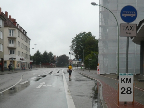 Wenig später kommt der 1. Verpflegungsposten mit viel Flüssigem und Obst. Wir sind im Stadtteil Geestemünde-Nord und haben gerade mal km 2 erreicht. Vor mir läuft ein Marathoni mit einem alten orangenen Bremerhaven- Marathon-Shirt. So eins habe ich auch noch, es ist von 2007.