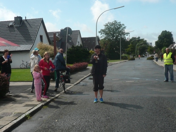 Es geht noch einmal durch den Bürgerpark mit Nedderwiesen-Runde. Die Sonne scheint, die Straßen trocknen ab. Das versprochen Weizen steht bereit und es stellt sich heraus, dass die junge Dame ebenfalls gelaufen ist und jetzt bis zum letzten Läufer an der Strecke bleibt.