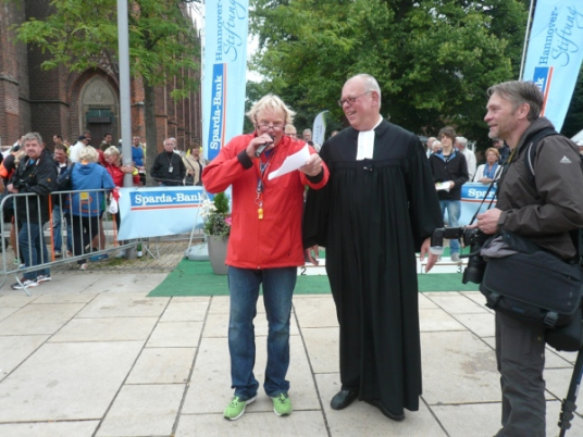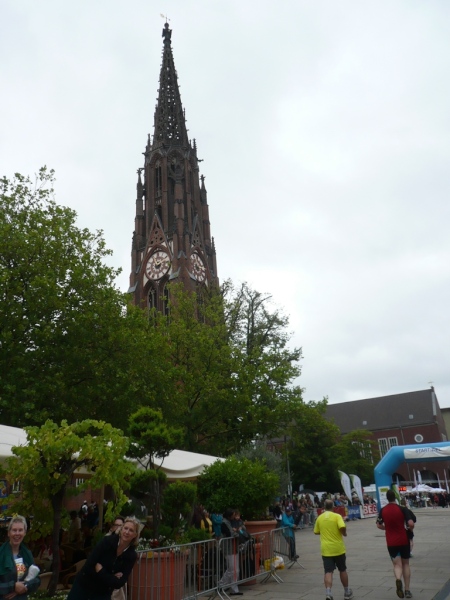 Die erste Runde ist geschafft, die 5km-Läufer und viele 10km-Läufer sind schon im Ziel. Die Staffeln wechseln hier. Wir laufen jetzt mit den Halbmarathonis nochmal in die gleiche Runde. Der Platz vor der Kirche ist noch gut gefüllt. Artur Schmidt interviewt gerade den Pfarrer, der auf das Brautpaar wartet. Wenige Minuten später kommen Martina und Vincenzo ins Ziel. Kurz vor der Zielmatte (oder Schwelle) halten sie an und Vincenzo trägt seine Frau darüber (hoffentlich funktioniert die Zeitmessung).
