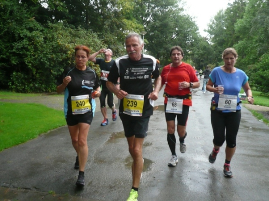 Das Feld ist deutlich ausgedünnt. Es wird windig und nach knapp 2 Stunden werden wir an die 70 % Niederschlagswahrscheinlichkeit erinnert. Zuerst nieselt es nur, dann ist es richtiger Regen. Im Bürgerpark sind die Wege gleich matschig und so manche Wade nimmt eine braune Färbung ein. Für eine Listung bei www.Trailrunning.de reicht das aber nicht.
