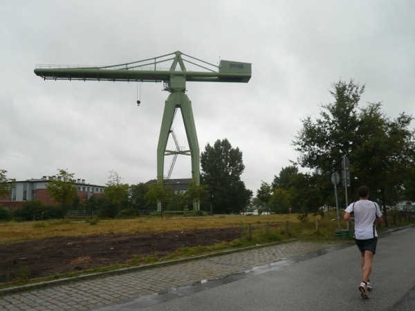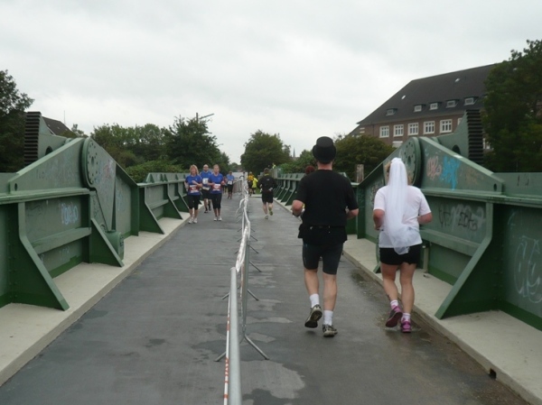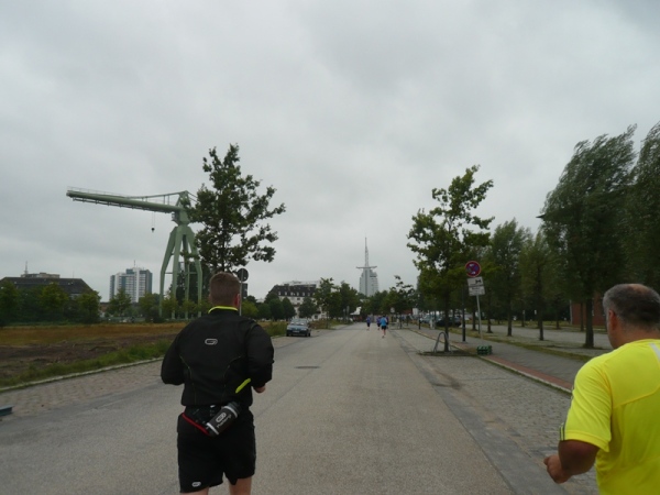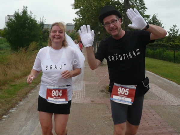 Ich laufe auf dem Geestheller Damm zwischen Geeste und Kapitänsviertel und überhole Braut und Bräutigam. Natürlich muss ich nachfragen, ob stimmt, was auf den Shirts steht. Martina und Vincenzo haben gestern standesamtlich geheiratet, laufen heute die 10km und werden anschließend nach dem Zieldurchlauf kirchlich heiraten, natürlich in Läuferkleidung. Na dann viel Glück und viele schöne Kilometer.
