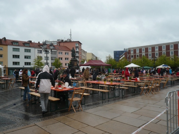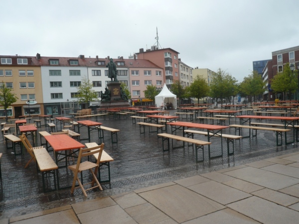 Der Regen hat aufgehört und die Sonne kommt schon mal durch die dicken Wolken. Trotzdem sind Straßen und Plätze jetzt fast menschenleer. Nein, stimmt nicht, in der Mozartstraße stehen immer noch Anwohner an der Straße. Mein Blick erspäht ein Weizenbier. Ohne langes Fragen und Bitten wird mir die Köstlichkeit gereicht. Und das Beste: Für den Rückweg verspricht man mir die nächste Lage.