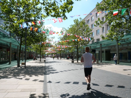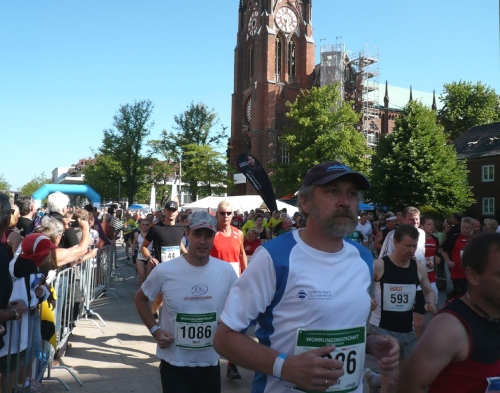 Wir sind am Ziel für die Halbmarathonläufer bzw. an der Großen Kirche. Viele Zuschauer sind hier, entsprechend gut ist die Stimmung. Auf einem schmalen Streifen laufen die nicht sehr zahlreichen Marathonis in die zweite Runde. Vor mir sehe ich Horst Preisler, hinter mir einen weiteren Läufer. Das ist alles. Die Einsamkeit des Langstreckenläufers.