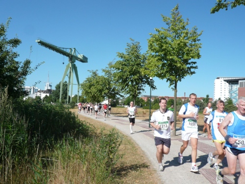 Jetzt geht es ein Stück an der Geeste entlang in nordöstliche Richtung. Obwohl sich das Läuferfeld schnell auseinander zieht, ist es hier noch etwas eng, Behinderungen gibt es aber nicht. Wir folgen der ersten Geeste-Biegung über die Uferstraße und überqueren später über eine alte metallene Brücke die Geeste. Unsere Laufrichtung geht gen Süden. Neben der nächsten Versorgungsstelle ist die Marineschule.
