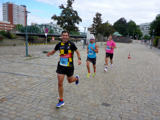 Wir laufen über die Brücke und haben die zweite Gelegenheit, ein paar Höhenmeter im platten Land zu sammeln. Hinter der Brücke führt die Strecke links ab, vorbei am Funkturm, Richtung Weser. Die Strecke ist teils abgesperrt und eifrige Streckenposten regeln mit tollem Einsatz, dass die Läufer einen freien Weg trotz der vielen Touristen haben. An dieser Stelle Danke an alle für den vorbildlichen Einsatz!