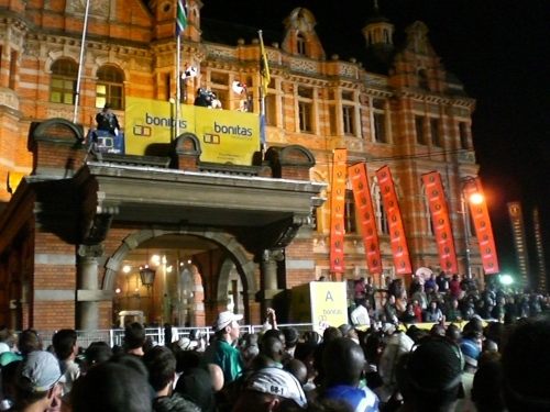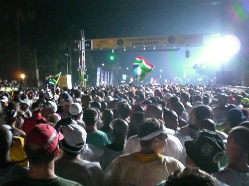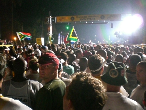 Ein Mix aus House- und Rock-Musik und Zulu-Pop dröhnt aus riesigen Boxen über den hell erleuchteten Startbereich. Zahlreiche Läufer tanzen sich warm. Es herrscht schon hier Feststimmung, statt nervöser Anspannung spürt man freudige Erwartung.