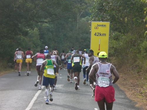 Durch waldiges Gelände geht es weiter. Bei der nächsten Verpflegungsstation fällt mir auf, dass die Physiotherapeuten besonders intensiv in Anspruch genommen werden. Kein Wunder: Bei km 47 steht der Dritte aus der Reihe der “Notorious Five” an: Bothas Hill. Das bedeutet: 120 Höhenmeter verteilt auf zwei Kilometer. Das Kilometerschild vor dem Anstieg macht mich nachdenklich: Es zeigt eine 42. Von hier aus ist also noch die Marathondistanz zu bewältigen. Ich stelle mir innerlich die Frage, ob und wie das meine Beine noch mitmachen. Bisher lief es ganz gut, aber die Belastung ist schon deutlich zu spüren, sodass ich ein wenig skeptisch bin, vor allem eingedenk der berüchtigten langen Bergabpassagen, die später noch anstehen. Andere scheinen aber schon mit ganz anderen Problemen zu kämpfen, insbesondere Krämpfen. Ein Läufer ist so weggetreten, dass er frontal gegen das 42 km-Schild läuft. Zumindest dann ist er aber aufgewacht - passiert ist nichts.