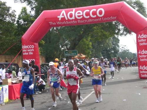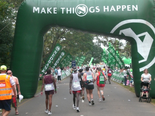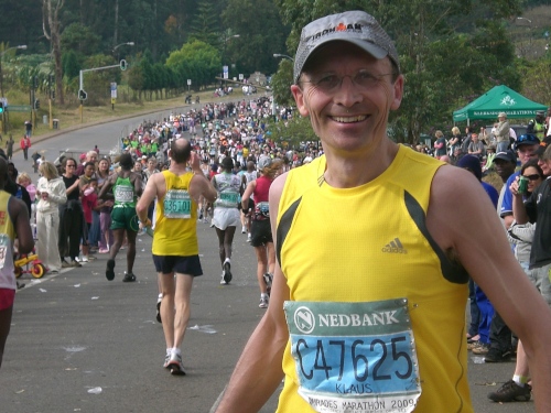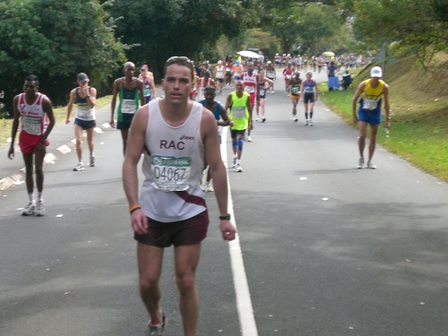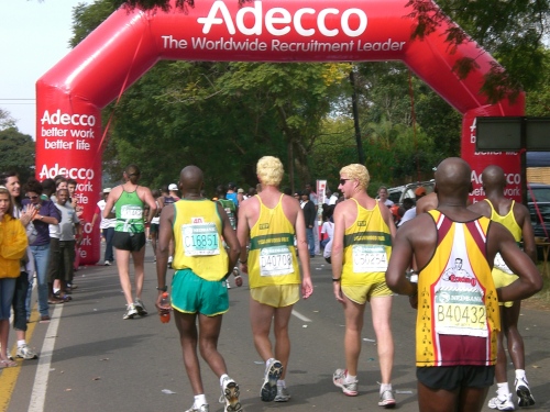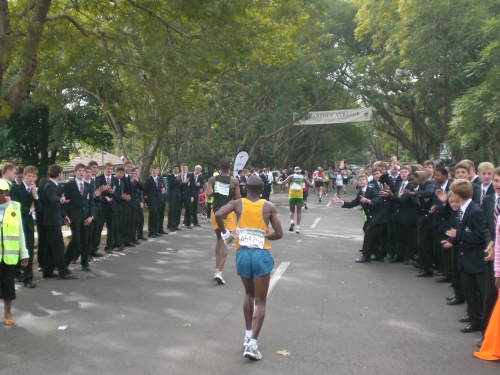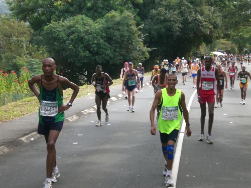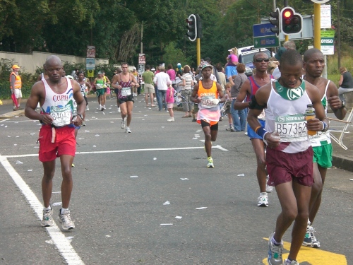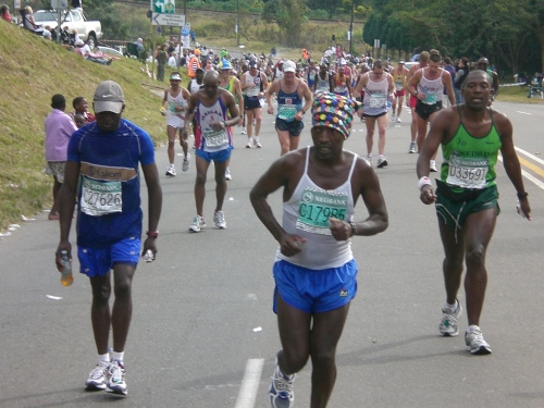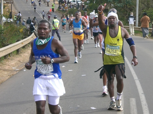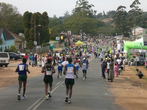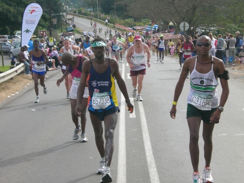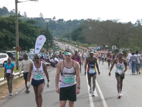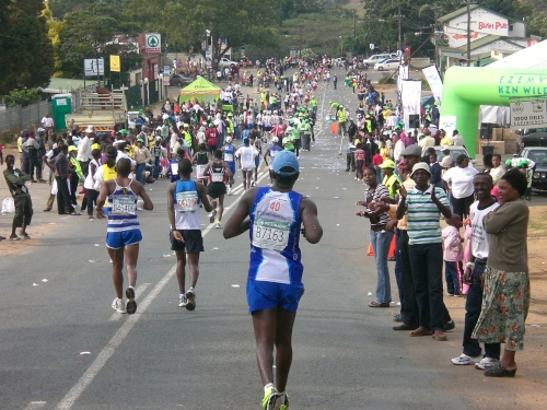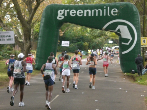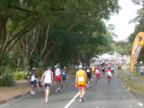 Bei km 57 erreichen wir Winston Park und folgen nun für ein paar Kilometer der der Schnellstraße M13, bis wir bei Kloof ein weiteres Mal Villenvorortluft schnuppern dürfen. Besonders idyllisch und familiär wirkt es hier. Inmitten üppigem Grün und unter hohen alten Bäumen laufen wir die speziell so genannte “Green Mile” dahin. Auf dem Rasen beidseitig der Straße ist kaum ein Platz zu sehen, der nicht von gemütlich picknickenden Menschen besetzt wäre. Häufig werde ich mit Namen gerufen und mit ein paar aufmunternden Worten bedacht. Das besonders Persönliche ist eben auch eines jener prägenden Merkmale dieses Laufs.