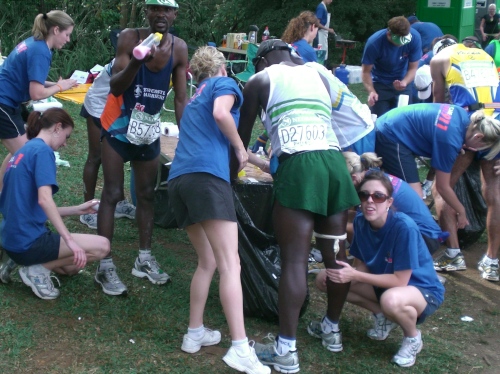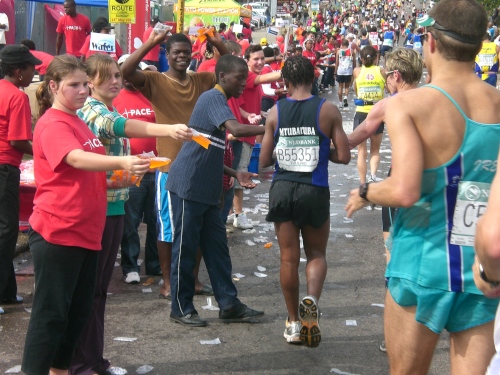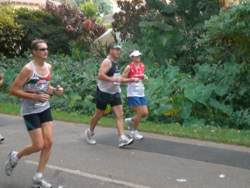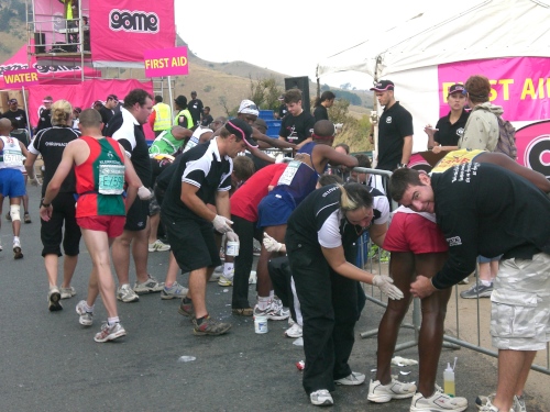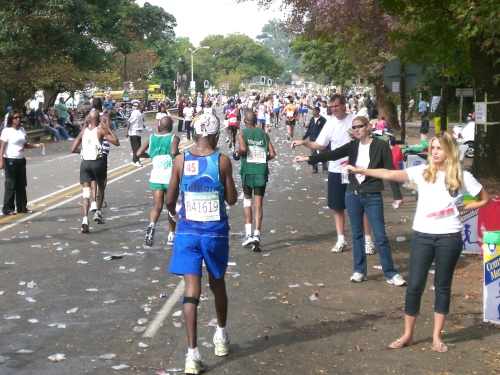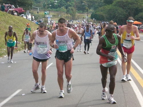 Berüchtigt ist der Fields Hill wegen seines langen, starken Gefälles nicht nur beim up run, sondern gerade auch beim down run. Denn nicht wenige erleben hier den muskulären Gau. Die ohnehin schon angeschlagene Beinmuskulatur wird durch das permanent erzwungene Abfedern beim Hinablaufen überstrapaziert. Manche humpeln hinab und schleppen sich zur nächsten Physiostation, bei anderen geht selbst dies nicht und sie müssen krampfgebeutelt stehen bleiben oder setzen sich einfach an den Straßenrand. Ich darf mich zu den Glücklichen schätzen, die - noch - ganz gut damit klar kommen.