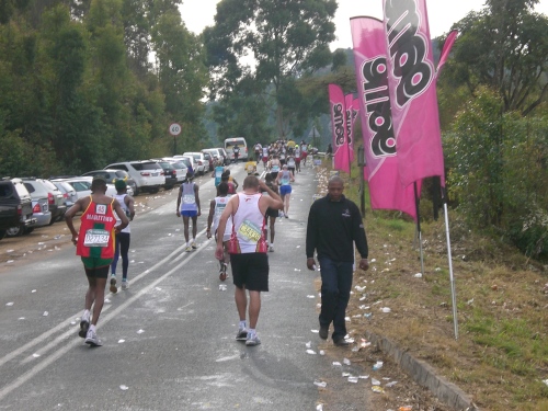 Bei km 63 heißt es - zumindest vorläufig - Abschiednehmen von der Freiluftparty. Wir erreichen Fields Hill. Dieser ist der vierte im Bund der “Big Five”, für uns allerdings ohne Anstieg verbunden. Ganz im Gegenteil: Von hier aus führt die Strecke auf einer gesperrten Hälfte der Schnellstraße M13 über 3,2 km steil hinab nach Pineville. Erst ab hier wird unser Lauf zum wirklichen “down run”, denn auf den 63 km zuvor haben wir effektiv kaum an Höhe gegenüber dem Start in Pietermaritzburg verloren. Etwa 200 Höhenmeter verlieren wir auf diesem Teilstück.