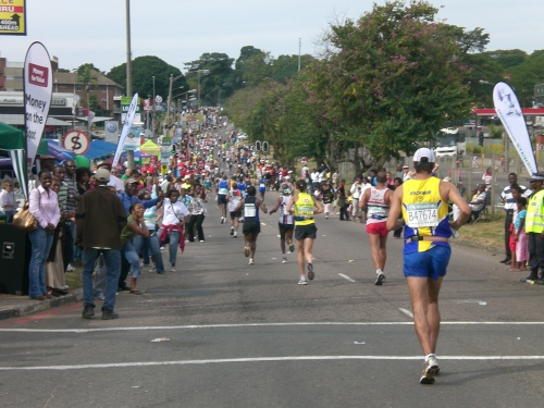 Villen und Landhäuser in parkähnlichen, subtropischen Gärten mit akkurat gepflegten Rasenflächen bestimmen das Bild auch im Nachbarort Hillcrest. Über Kilometer haben sich die Bewohner der beiden Orte an der Straße aufgestellt und feiern die vorüberziehende Läuferschar. Viele haben es sich, häufig die ganze Familie oder mit Freunden, entlang der Strecke mit Stühlen, Tischen oder auch nur Decken bequem gemacht, es wird gepicknickt oder auch nur Bier getrunken, oder aber ein traditionelles Baai, die südafrikanische Variante des Freiluft-Barbecue, veranstaltet. Der Geruch gegrillten Fleisches dringt mir immer wieder verlockend in die Nase. Mir kommt das Ganze vor wie eine einzige riesige Freiluftparty, bei der wir den Part der Tänzer übernehmen, während die anderen an der Bar stehen und zuschauen.