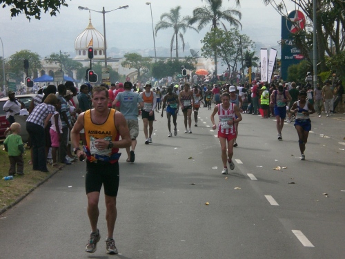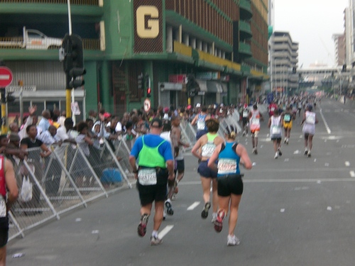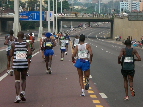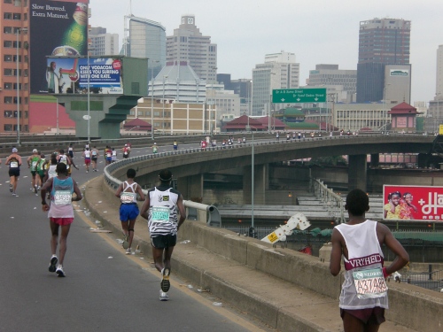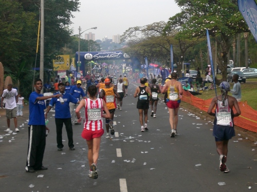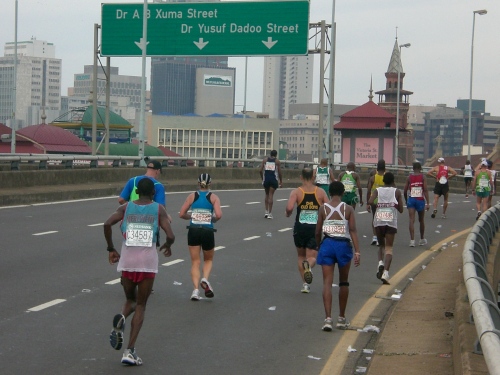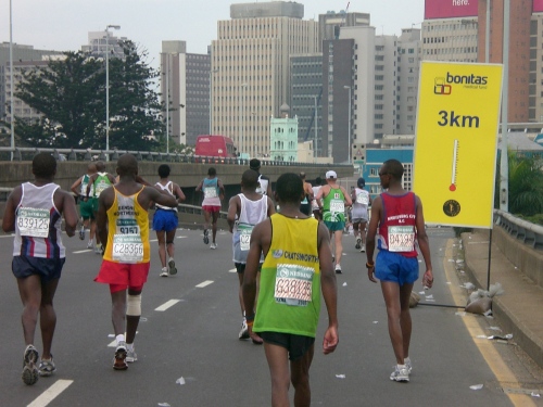 Die nächsten Kilometer sind richtig hart, zumal die Umgebung nicht allzu aufregend ist und die Zuschauerreihen nicht ganz so dicht sind - Schnellstraßenflair eben. Das permanente Auf und ab hält an und ich wechsele ebenso permanent vom Lauf- in den Gehschritt. Immer mehr Läufer sehe ich ausgeknockt mühsam dahin schleichen und noch immer trennen uns viele Kilometer vom Ziel. In der Ferne taucht erstmals die Skyline Durbans im dunstigen Himmel auf - oh, ist das noch weit.