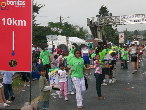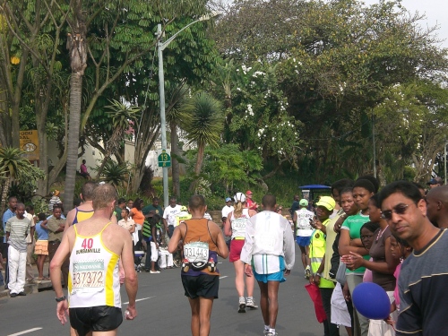 Bei km 66 biegen wir in das eher gesichtslose Pinetown ab. Allerdings bezieht sich die Gesichtslosigkeit allein auf das Bauliche, nicht auf die Menschen, die uns hier wieder gut gelaunt zu Tausenden erwarten. And the Party goes on ... Über Kilometer geht es geradeaus über die Old Main Road, die als Hauptstraße Pinewood durchzieht, dahin. Es gelingt mir einigermaßen meinen Trott beizubehalten und ich lasse mich gerne von dem Trubel um mich herum und den netten Anfeuerungsrufen ablenken. Ich kann mich wirklich nicht erinnern, jemals einen Lauf erlebt zu haben, der so von den Zuschauern emotional mitgetragen und mitgelebt wurde, und zwar nicht nur an wenigen Punkten, sondern fast entlang der ganzen Strecke.