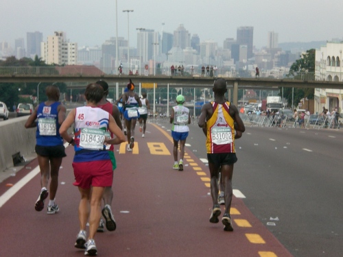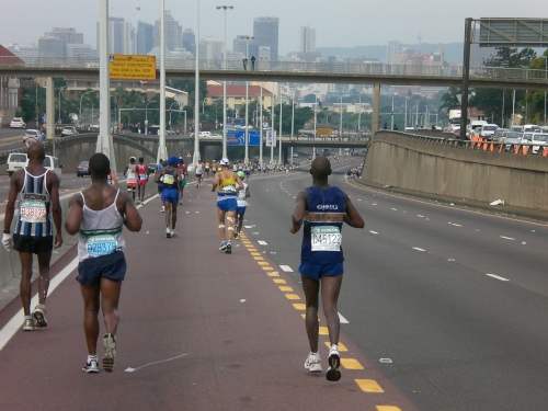 Hatte ich gedacht, dass es in Durban nur noch bergab in Richtung Ziel geht, so muss ich mich eines besseren belehren lassen. Die Steigungen nehmen kein Ende. Auch wenn sie längst nicht mehr so lang wie die Abwärtspassagen sind, so nehme ich sie doch viel intensiver wahr als vorher. Richtig steil wird es kurzzeitig nochmals bei km 80. Hier verlassen wir die M13 und erklimmen über eine Rampe die drei-, teilweise 4-spurige Autobahn N3, die stadteinwärts komplett für uns abgeriegelt ist. Viel Platz ist hier für die dünn gewordene Kette der Läufer, richtig verloren komme ich mir auf der riesigen Straße vor. Großartig ist das Panorama in Laufrichtung auf die Hochhauskulisse von Central Durban. Sie wirkt wie das typische Downtownbild einer amerikanischen Großstadt. Langsam, aber doch beständig, rückt sie näher. Hoch erhebt sich die Autobahn über das Umland.