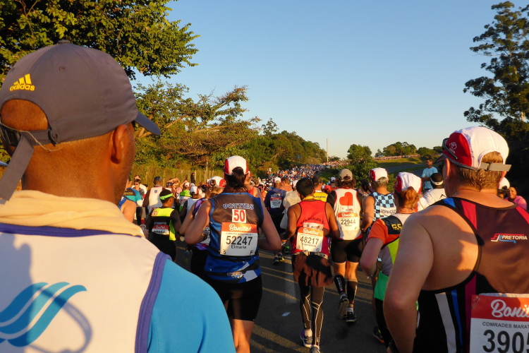 Kurz vor dem Start wird die Südafrikanische Nationalhymne gespielt. Alle nehmen die Mützen ab, die Einheimischen legen die Hand aufs Herz und singen inbrünstig mit. Dann wird die zweite „Nationalhymne“ angestimmt. Das ehemalige Arbeiterlied Shosholoza ist auch international bekannt und bedeutet so viel wie „geh voran“. Für solch einen Lauf also eine perfekte Einstimmung. Es ist unbeschreiblich und ergreifend, Teil dieses riesigen Chores zu sein. Verstohlen wird die eine oder andere Träne aus dem Auge gewischt. Einem kurzen Moment der Stille folgt Chariotts of Fire, das dann in tausendfachem Jubel ausklingt. Wer hier nicht ergriffen ist, ist fehl am Platz. Traditionell ertönt nach dem Startschuss ein dreimaliger Hahnenschrei (nicht Original sondern vom Band). Dann geht es endlich los.