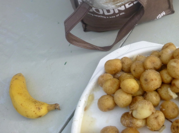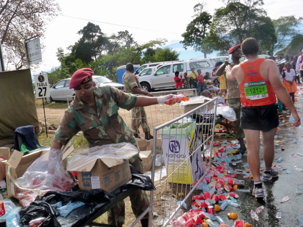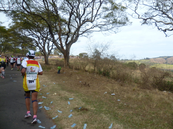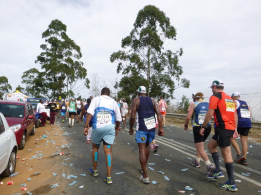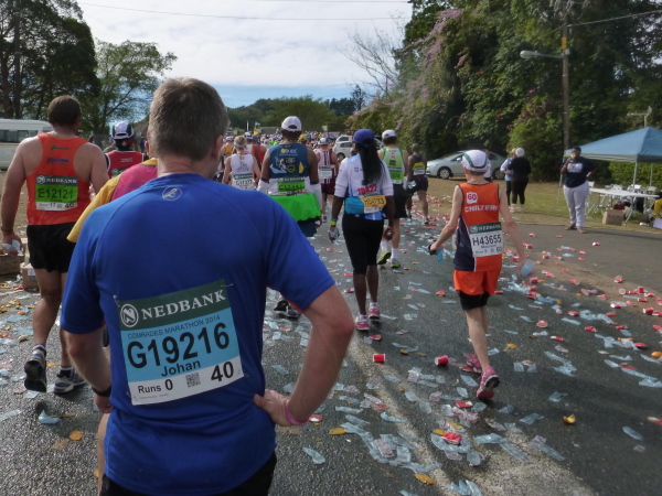 Ich greife nach Wasser. Mit den Fingern bekomme ich das Beutelchen nicht auf. Mit den Zähnen geht es. Jetzt klemmt ein Stück Folie zwischen den Zähnen. Mit einiger Mühe puhle ich das wieder heraus. Dieses Problem wird mich bis ins Ziel verfolgen. Gleichzeitig muss ich mich auf die weggeworfene Beutelchen und Becher konzentrieren und auf die durcheinander laufende Mitläufer aufpassen. Es ist toll, wenn einer auf ein volles am Boden liegendes Beutelchen tritt. Mit lautem Knall entleert es sich nach allen Richtungen auf die Beine der Nebenmänner und -frauen. Allmählich lasse ich das Chaos hinter mir. Ich probiere verschiedene Trinktechniken. So beschäftigt, erreiche ich bereits die nächste VP. Also, verdursten werde ich hier nicht.