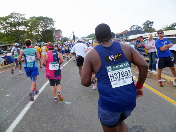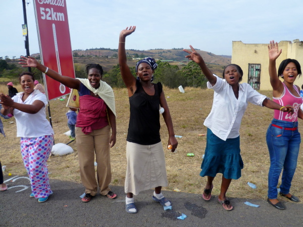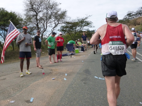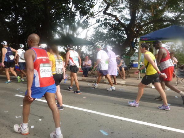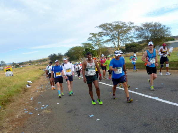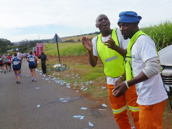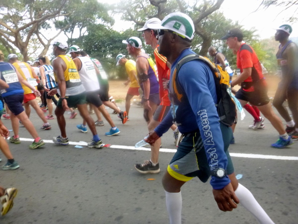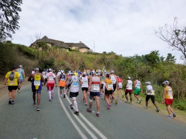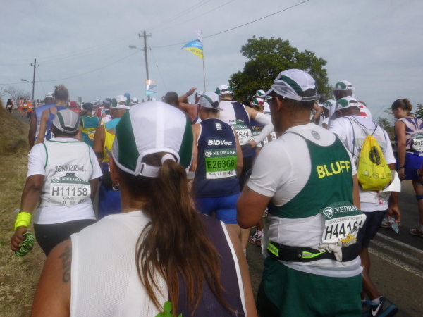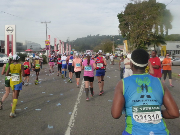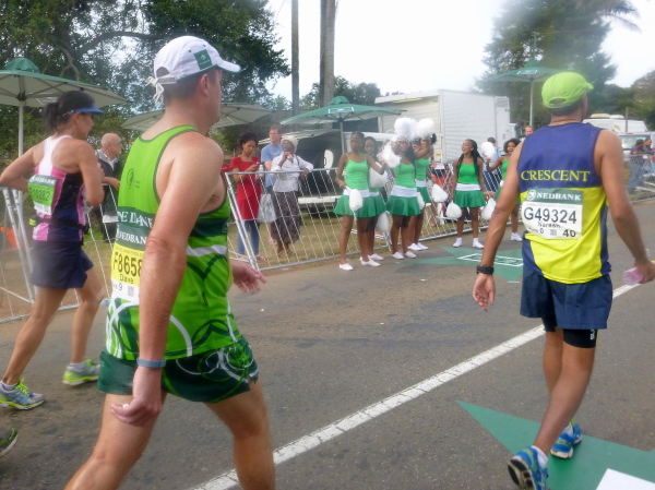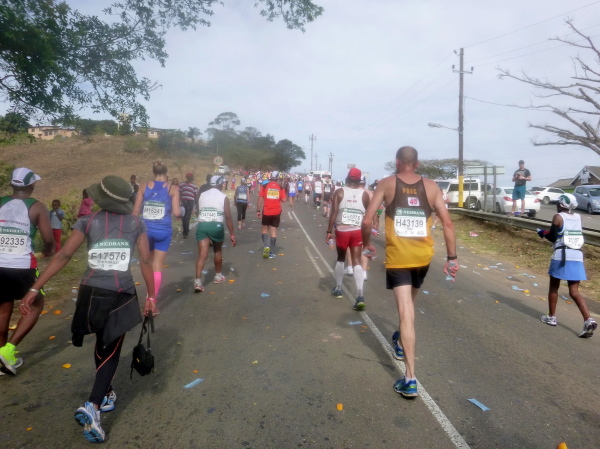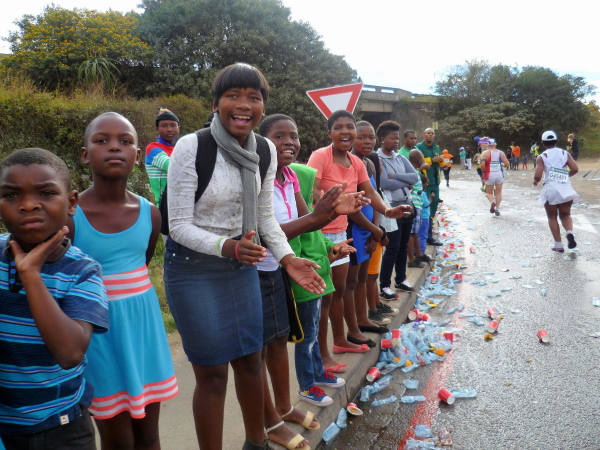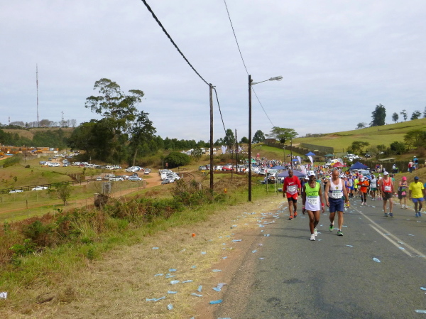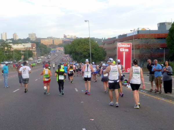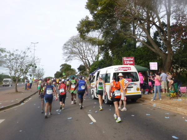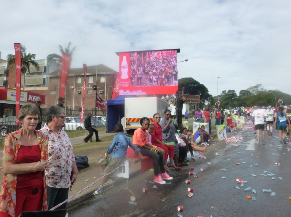 Am cut off von St. Johns Avenue oder Cowies Hill mit 10 Stunden komme ich mit 9 Stunden 16 durch. Es sind jetzt keine 20 Kilometer mehr. Mittlerweile habe ich mich vor den dritten 12 Stunden Bus gesetzt. Ich bin gespannt, wann die mich wieder einholen. Wir haben die ersten Vororte von Durban erreicht. Die Zuschauer werden immer zahlreicher. Obwohl der Führende wahrscheinlich vor gut 4 Stunden hier vorbei gekommen ist, werden sie nicht müde, uns anzufeuern. Wegen der Hitze bieten die Zuschauer immer wieder Getränke an.