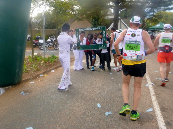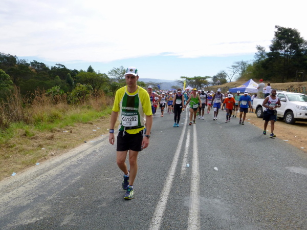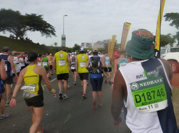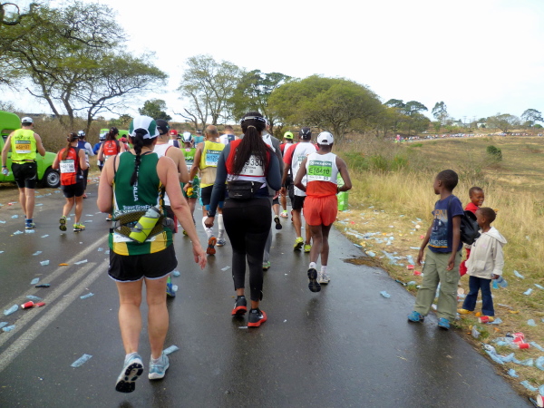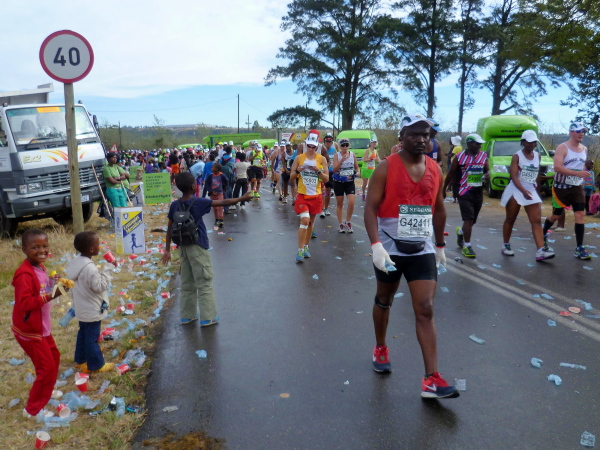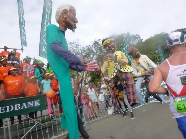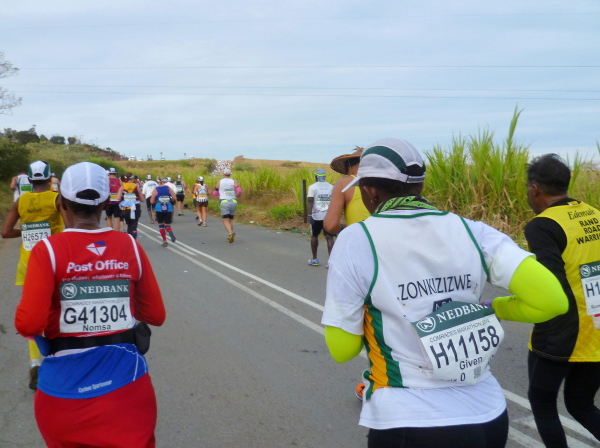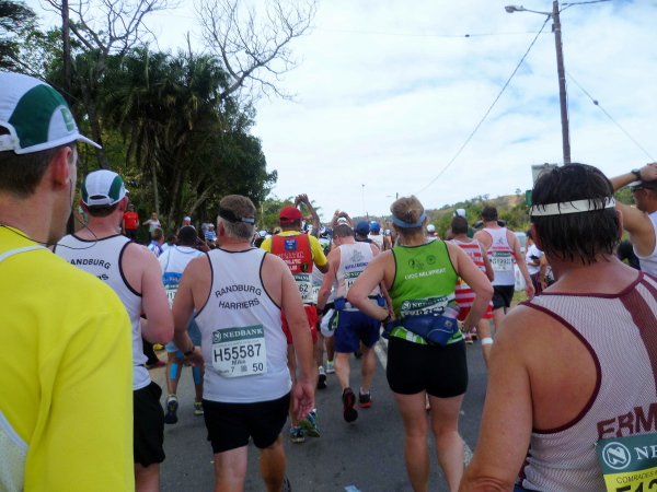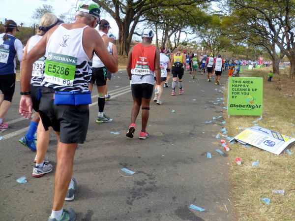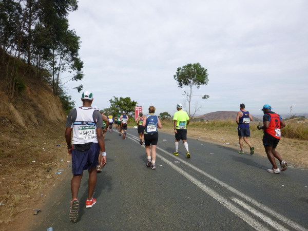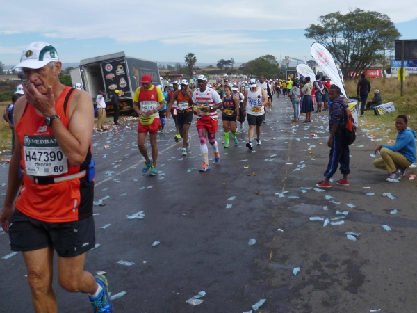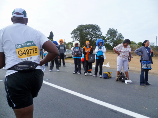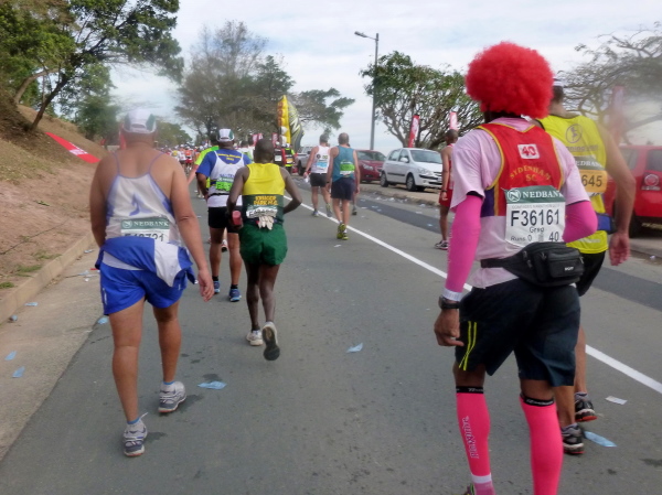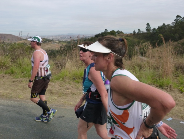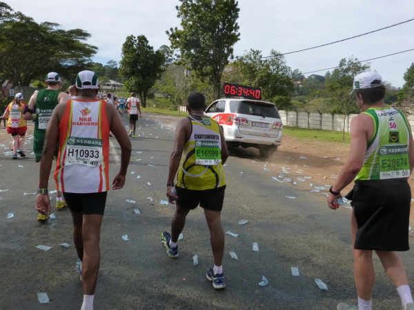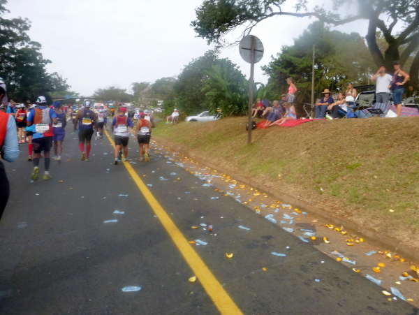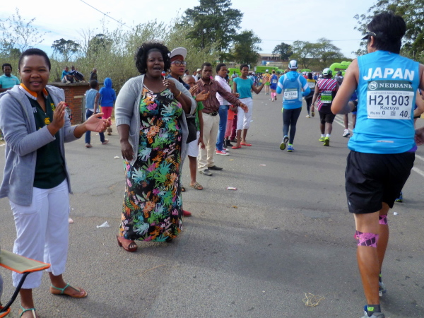 Am cut off von St. Johns Avenue oder Cowies Hill mit 10 Stunden komme ich mit 9 Stunden 16 durch. Es sind jetzt keine 20 Kilometer mehr. Mittlerweile habe ich mich vor den dritten 12 Stunden Bus gesetzt. Ich bin gespannt, wann die mich wieder einholen. Wir haben die ersten Vororte von Durban erreicht. Die Zuschauer werden immer zahlreicher. Obwohl der Führende wahrscheinlich vor gut 4 Stunden hier vorbei gekommen ist, werden sie nicht müde, uns anzufeuern. Wegen der Hitze bieten die Zuschauer immer wieder Getränke an.