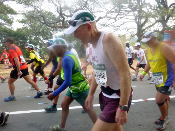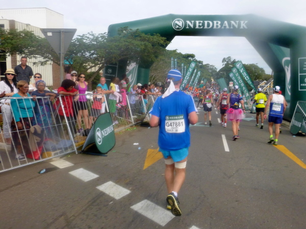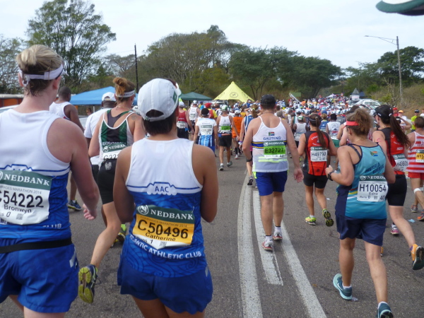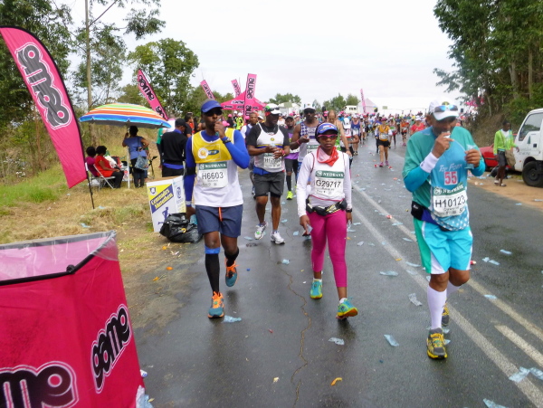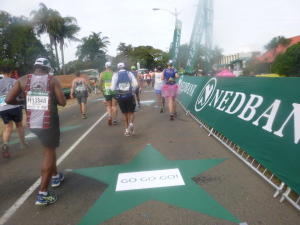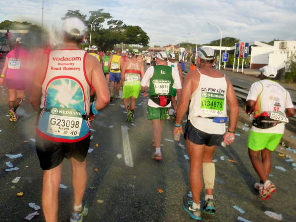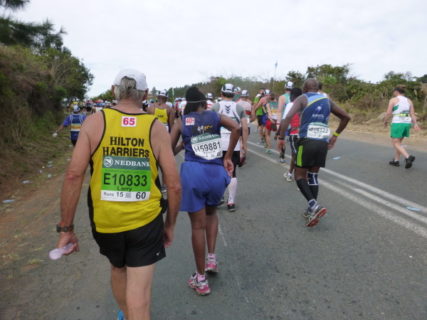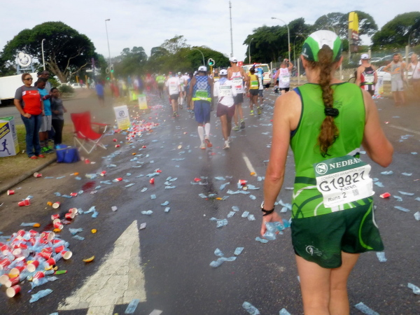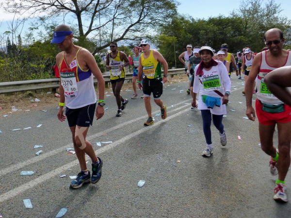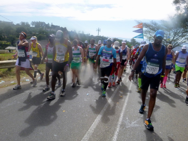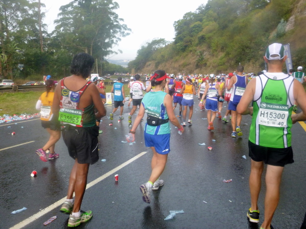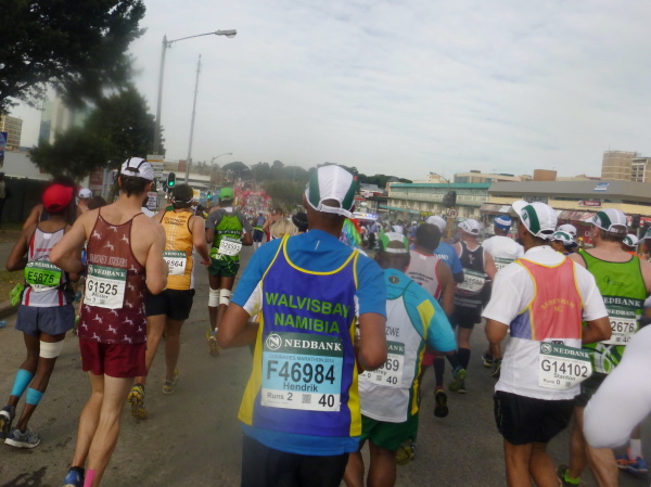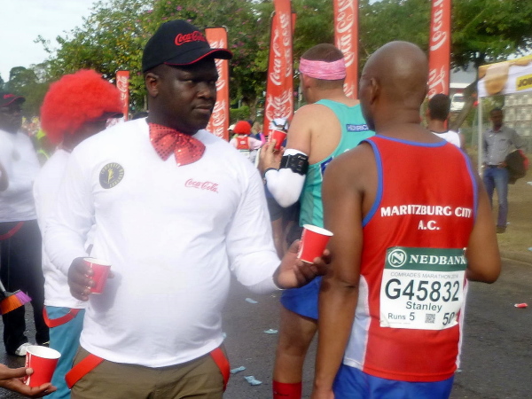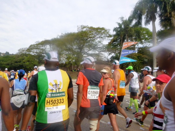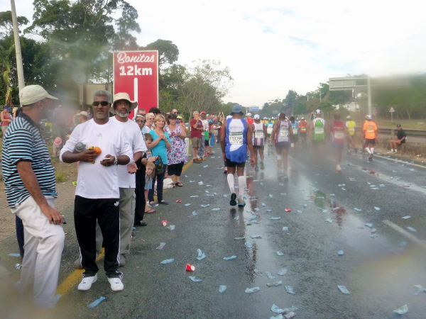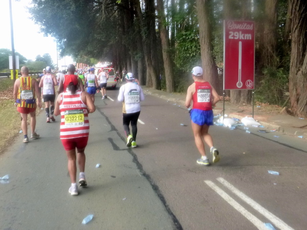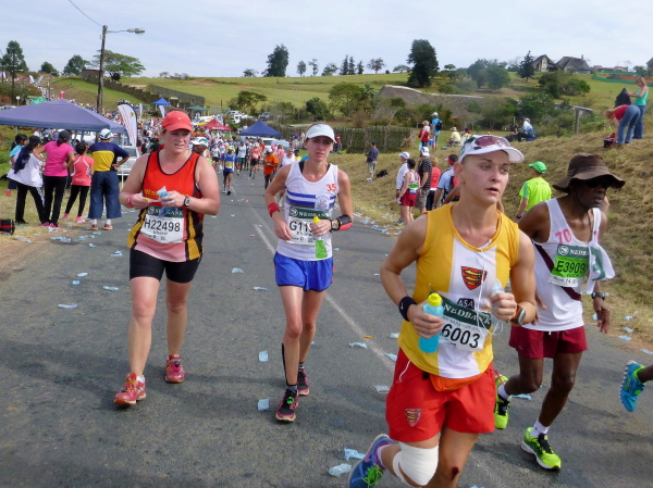Am cut off von St. Johns Avenue oder Cowies Hill mit 10 Stunden komme ich mit 9 Stunden 16 durch. Es sind jetzt keine 20 Kilometer mehr. Mittlerweile habe ich mich vor den dritten 12 Stunden Bus gesetzt. Ich bin gespannt, wann die mich wieder einholen. Wir haben die ersten Vororte von Durban erreicht. Die Zuschauer werden immer zahlreicher. Obwohl der Führende wahrscheinlich vor gut 4 Stunden hier vorbei gekommen ist, werden sie nicht müde, uns anzufeuern. Wegen der Hitze bieten die Zuschauer immer wieder Getränke an.
