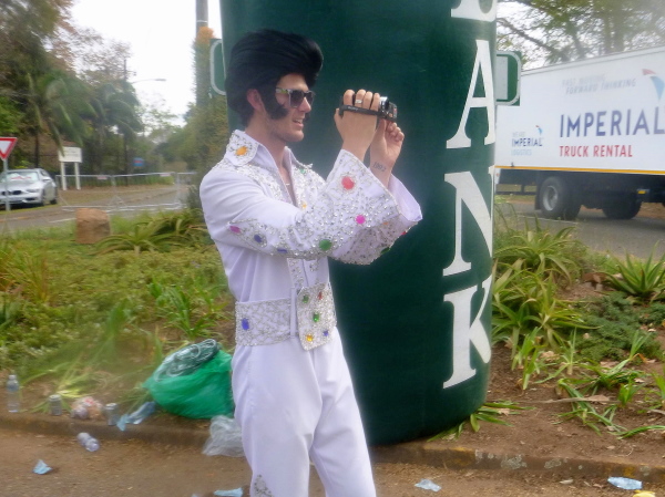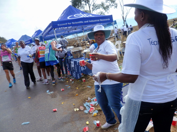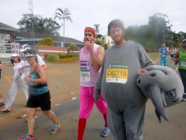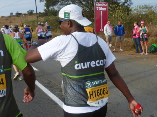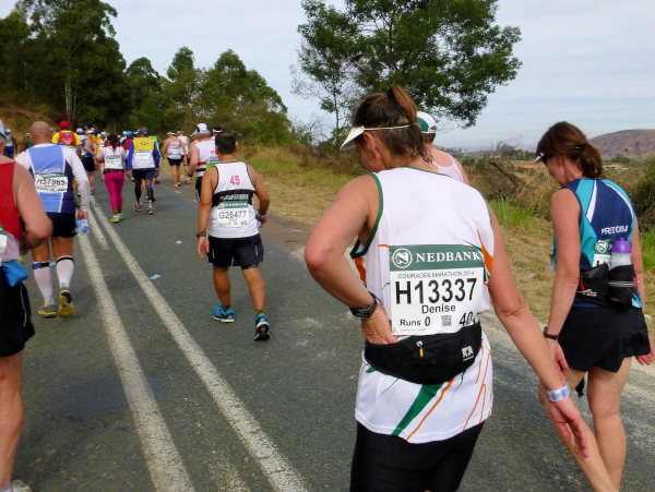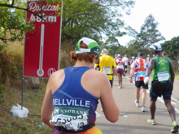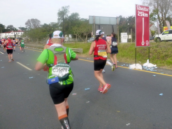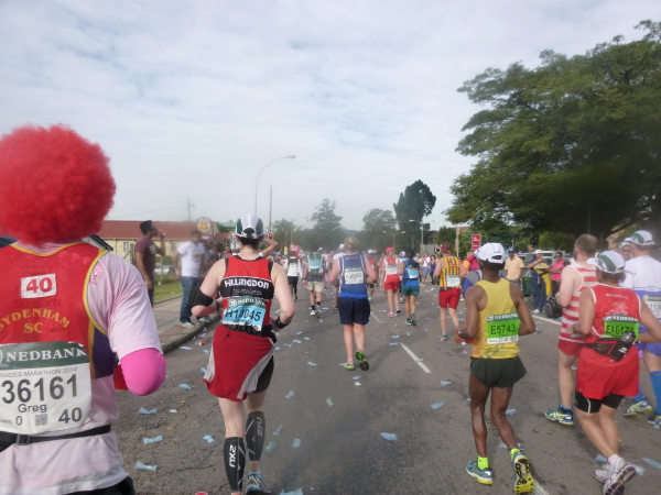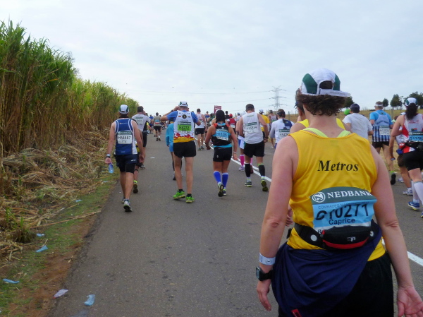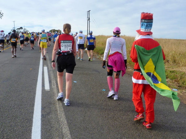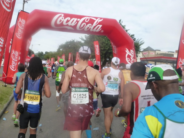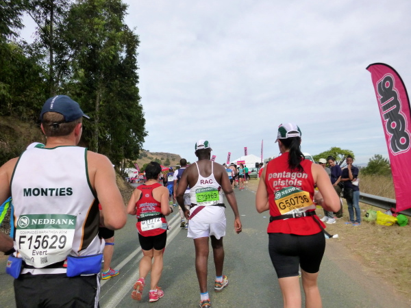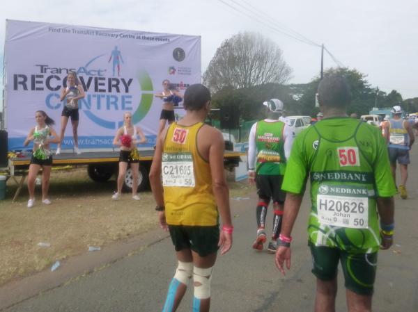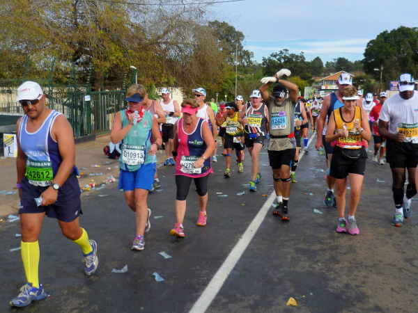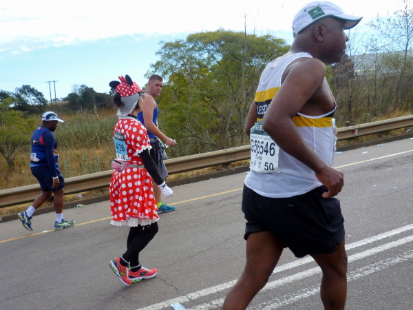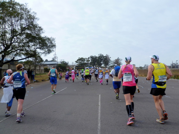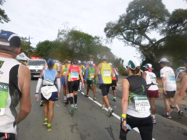 Am cut off von St. Johns Avenue oder Cowies Hill mit 10 Stunden komme ich mit 9 Stunden 16 durch. Es sind jetzt keine 20 Kilometer mehr. Mittlerweile habe ich mich vor den dritten 12 Stunden Bus gesetzt. Ich bin gespannt, wann die mich wieder einholen. Wir haben die ersten Vororte von Durban erreicht. Die Zuschauer werden immer zahlreicher. Obwohl der Führende wahrscheinlich vor gut 4 Stunden hier vorbei gekommen ist, werden sie nicht müde, uns anzufeuern. Wegen der Hitze bieten die Zuschauer immer wieder Getränke an.