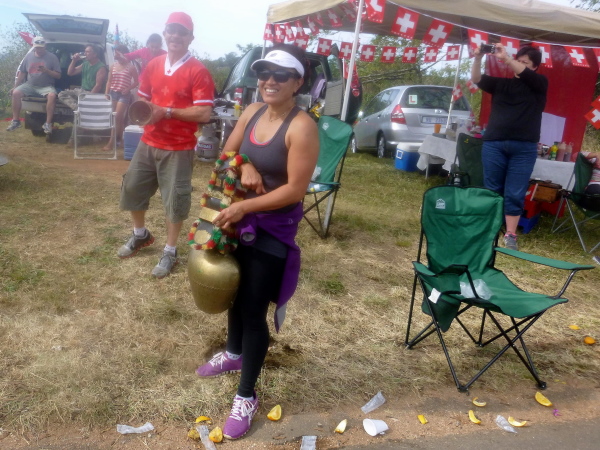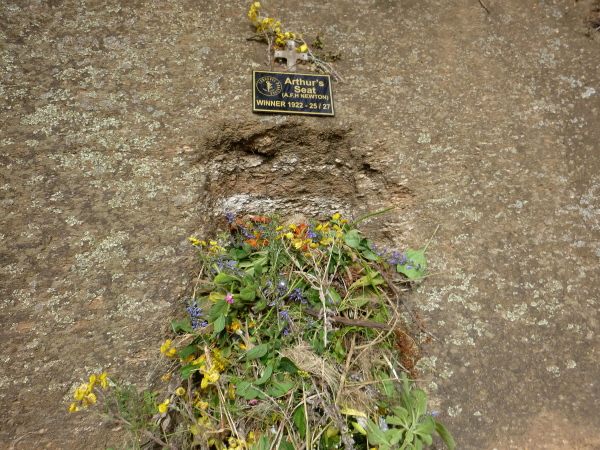 Die Gegend erscheint mir von der Bustour bekannt. Ein grandioser Ausblick ins Tal der 1000 Berge begleitet uns schon einige Kilometer. Hinter der nächsten Kurve müsste sich „Arthurs Seat“ befinden. Wo zum Teufel bekomme ich jetzt eine Blume her? Naja, ein grüner Zweig tut es vielleicht auch. In der Felsennische liegt bereits ein bunter Strauß. Ich werfe meine Ästchen dazu und habe vergessen, was man sagen muss. Ich versuche es mit „Guten Morgen“. Hoffentlich nimmt Arthur das nicht allzu genau. Vor der „Wall of fame“ wird heftig gegrillt und ein Partyzelt reiht sich ans nächste. Die Stimmung unter den Zuschauern ist super. Wir kämpfen uns den Berg hinauf.