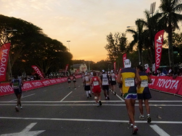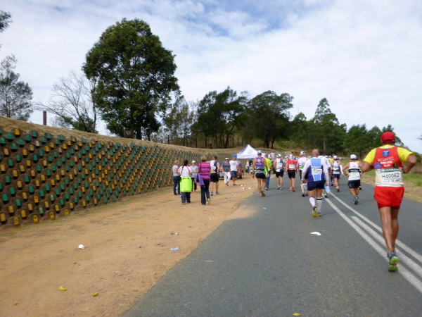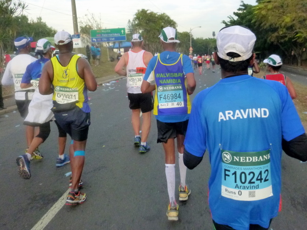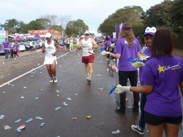 Die erste Verpflegungsstelle bei km 4 lasse ich aus. Langsam wird es heller. Um Viertel vor sieben geht die Sonne auf und taucht die Landschaft in orangenes Licht. Es wird Zeit, mir den Ablauf an den Verpflegungsstellen anzusehen. Unzählige Helfer sind damit beschäftigt, an langen Tischen Getränke an die nicht enden wollende Schlange der Läufer zu verteilen. Wasser wird in kleinen verschweißten 100 ml Beutelchen ausgegeben. Gatorade in blau, grün und orange entsprechend den verschiedenen Geschmacksrichtungen, ist ebenfalls so verpackt. Cola gibt es im Becher. Laut Ausschreibung werden erst ab km 40 Bananen angeboten. Da die 47 Verpflegungsstellen von verschiedenen Gruppen betreut werden, ist das Angebot vorher nicht bekannt. Zur Vorsicht habe ich Früchteriegel und Gel dabei.