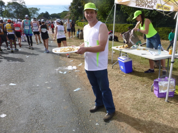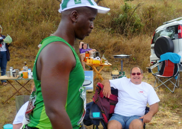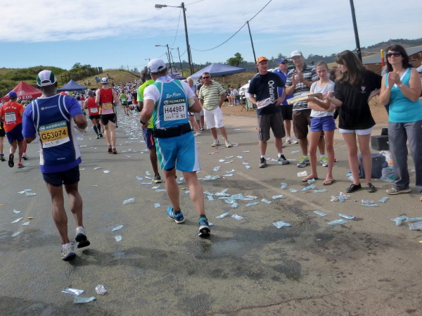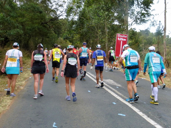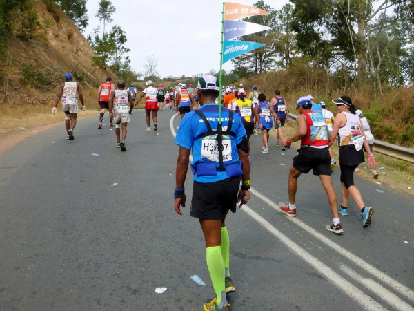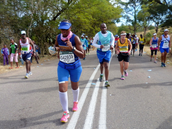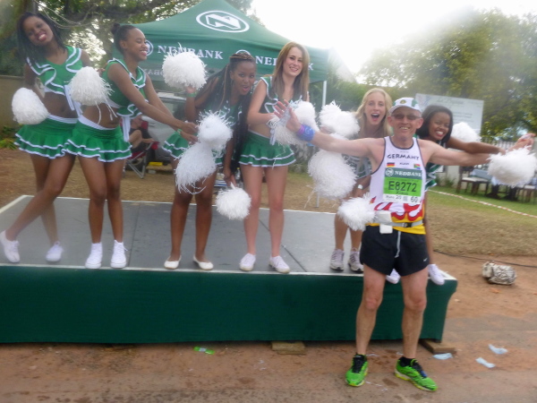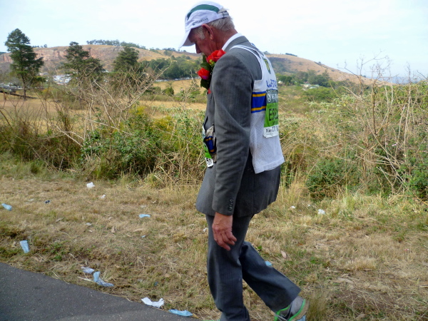Aber nicht lange, dann kommt die Gruppe schon wieder und verschluckt mich. Da spricht mich Klaus von hinten an. Von Krämpfen geplagt hat er vor, mit dem „Bus“ ins Ziel zu laufen. Langsam erwachen meine Lebensgeister wieder. Klaus wird wegen seines auffallenden Germany-Shirts gefeiert. Mir kommt es vor, als ob es die Einheimischen schwer glauben können, dass jemand 10 000 Kilometer fährt, um an einem Lauf teilzunehmen. Es ist aber kein Neid, sondern Stolz auf dieses großartige Event, der aus ihrer Begeisterung spricht.