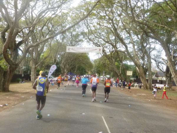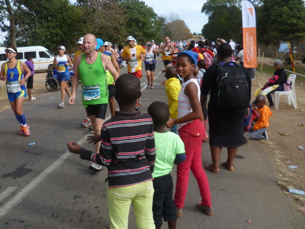 Wir erreichen die Ethembeni School for Handicapped Children. Wie erwartet, sind hier alle Kinder da um die Läufer anzufeuern. Ich klatsche unzählige Kinderhände ab. Ohne es zu merken, bin ich deutlich schneller geworden. Sobald die Strecke wieder ruhiger wird, muss ich das korrigieren.